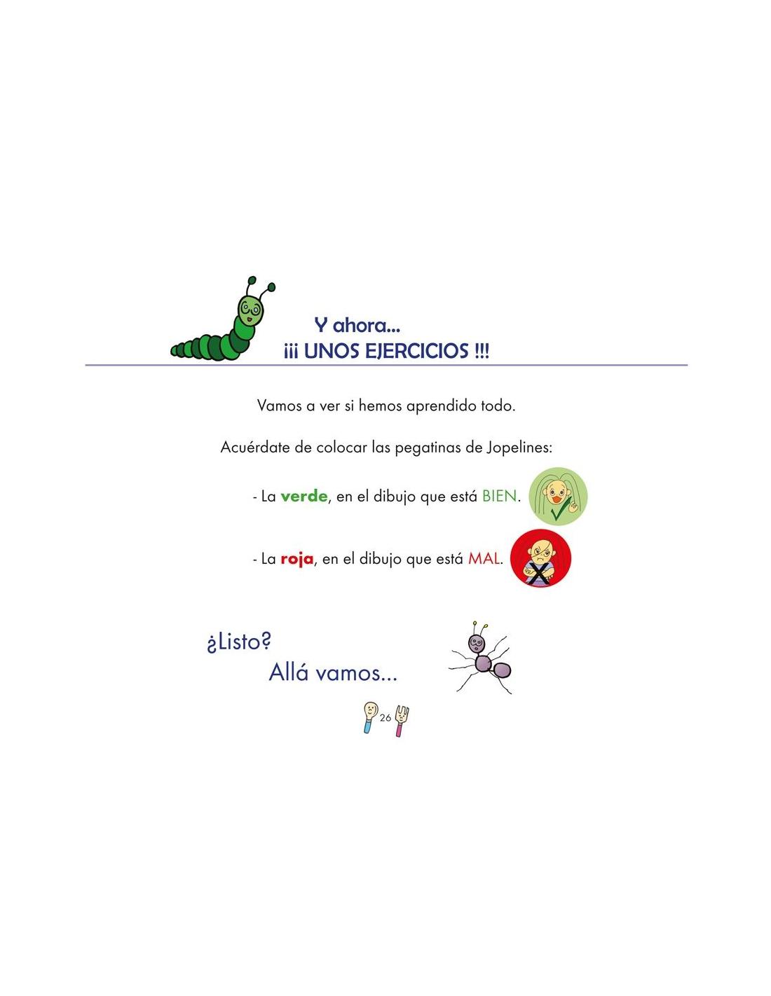 Por último, incluye dos páginas de pegatinas ilustradas en color verde y rojo para que el alumno pueda indicar si es correcto o incorrecto. Así, el/la alumno/a podrá trabajar con los adhesivos de forma más autónoma y aumentar, de este modo, su confianza.