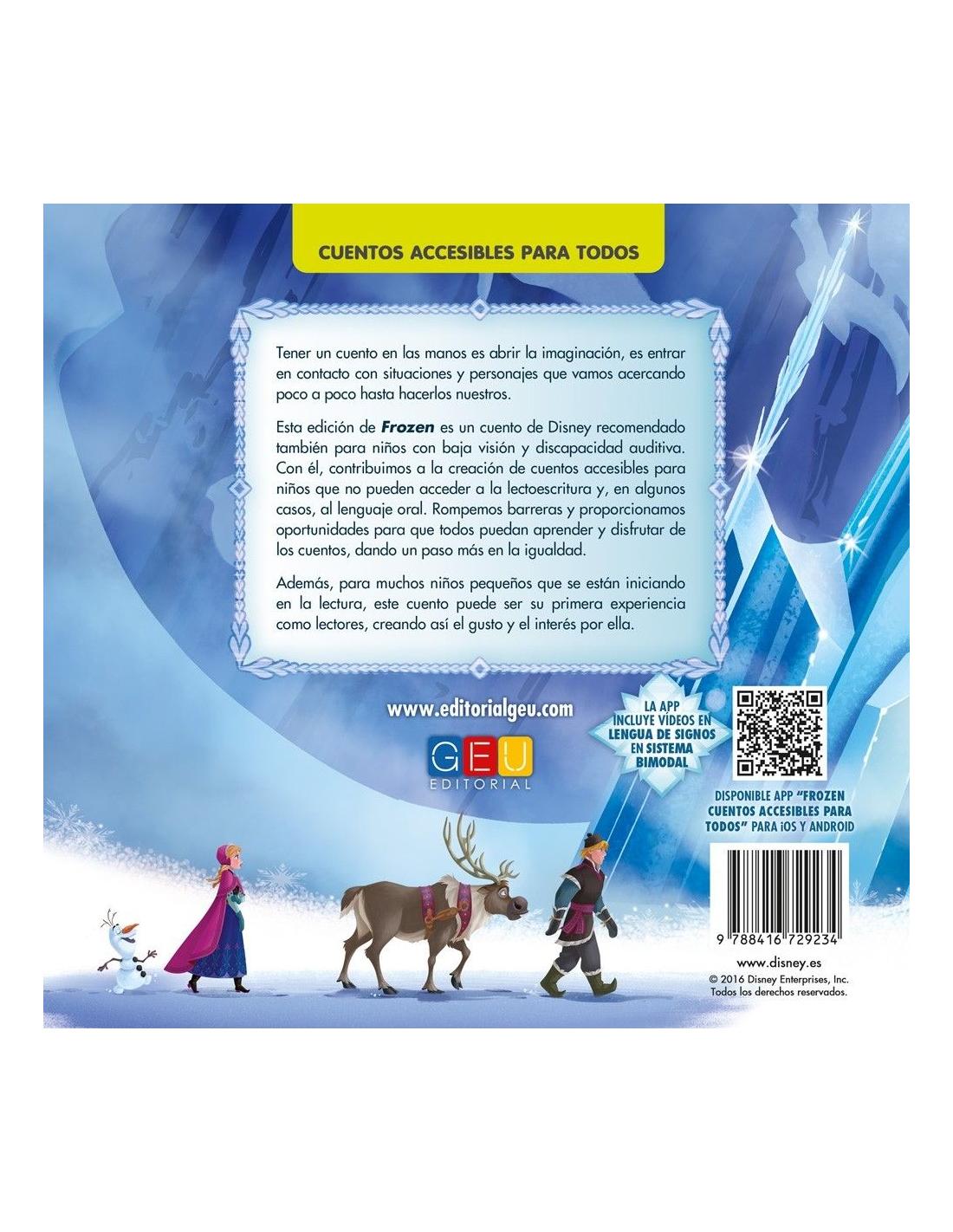 Incluye App gratuita "Frozen Cuentos Accesibles para Todos", con la que tendrás una nueva herramienta de comunicación aumentativa-alternativa gracias a la Lengua de Signos en Sistema Bimodal. Con ella todos los niños podrán seguir la historia visualmente y en movimiento, haciendo más fácil para ellos la asimilación y el aprendizaje de conceptos y construcción de frases, así como la comunicación con los demás. Especialmente recomendado para niños con baja visión y/o discapacidad auditiva.