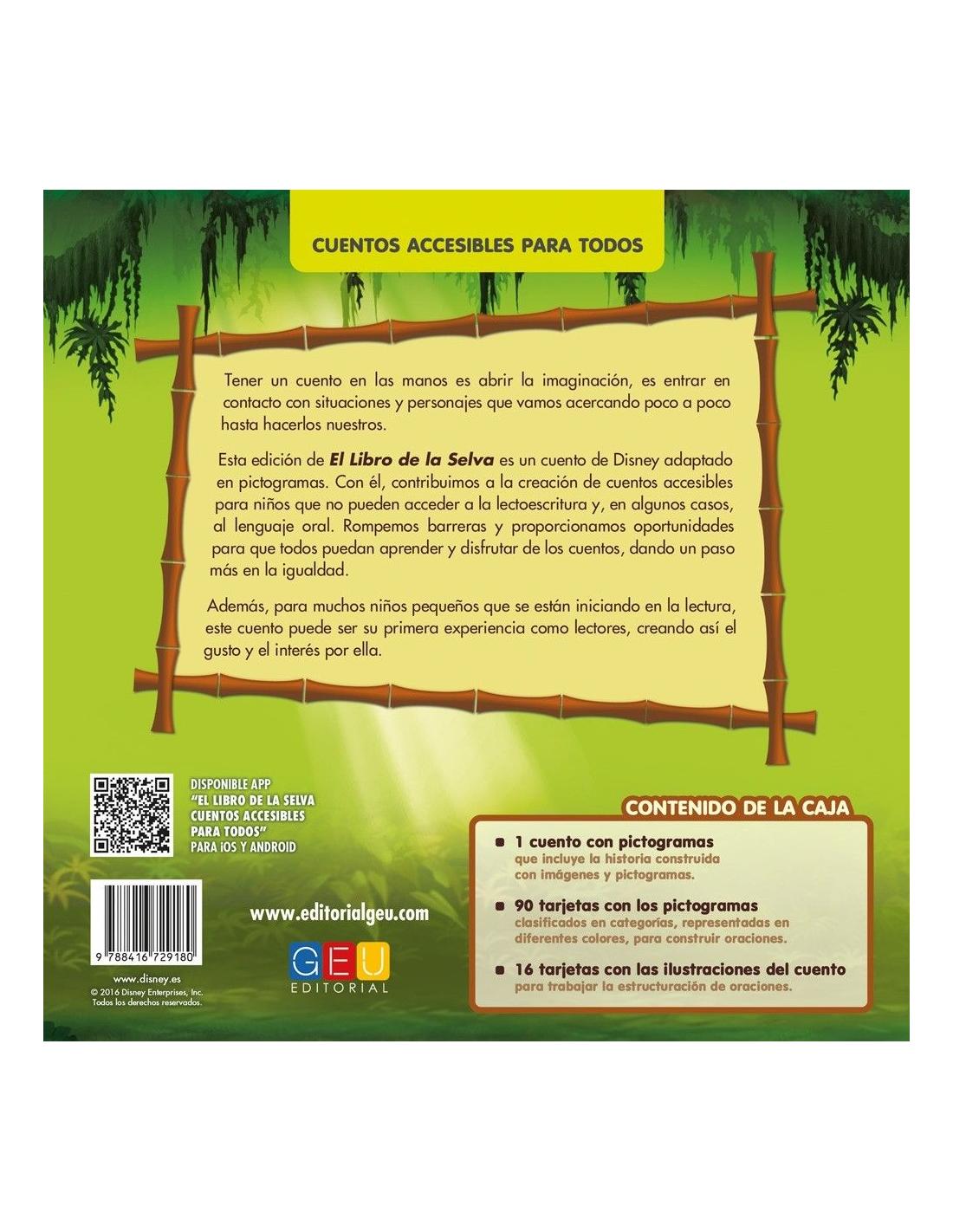 Esta caja contiene un cuento con pictogramas de El Libro de la Selva, tarjetas ilustradas y tarjetas con pictogramas en alta calidad para realizar las actividades. Todo lo necesario para que puedan realizar muchos y muy diferentes ejercicios que motiven su aprendizaje, fomenten su interés por la lectura y desarrollen sus capacidades.