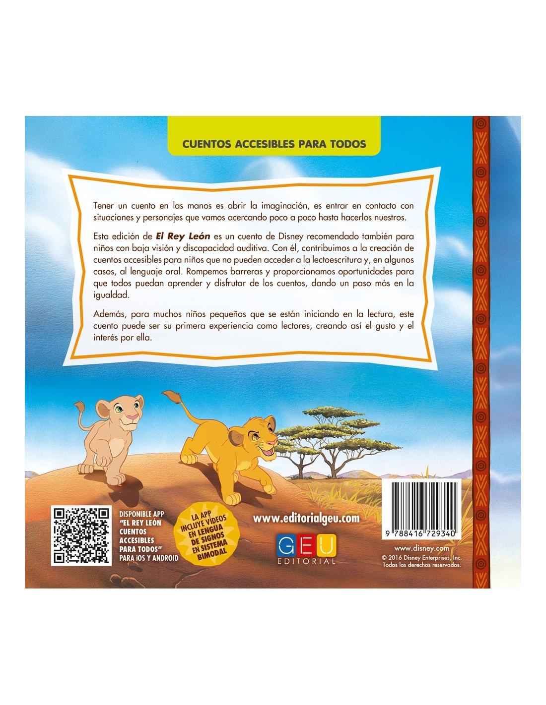 El cuento con lectura facilitada de El Rey León es una adaptación con la cual el clásico de Disney será accesible para todos. Gracias a la sencillez de los textos y al gran tamaño de letra que se utiliza se convierte en el libro perfecto para alumnos de Educación Infantil que se estén iniciando en la lectoescritura y niños con baja visión y/o con discapacidad auditiva.