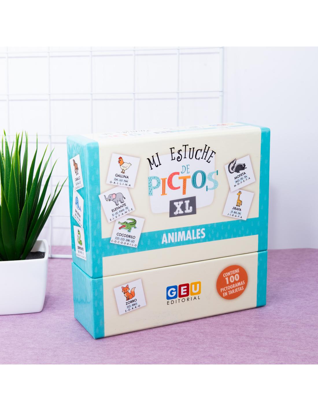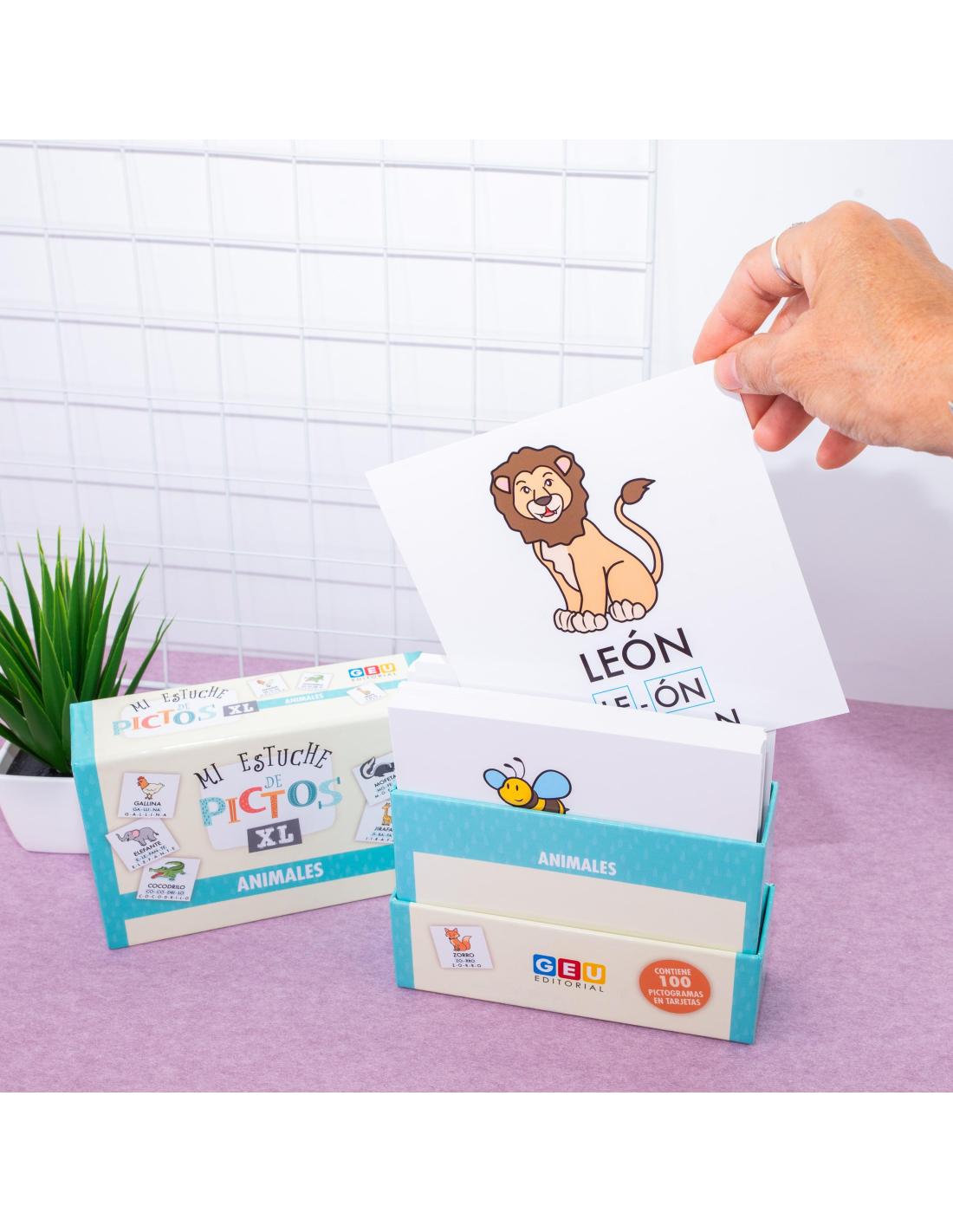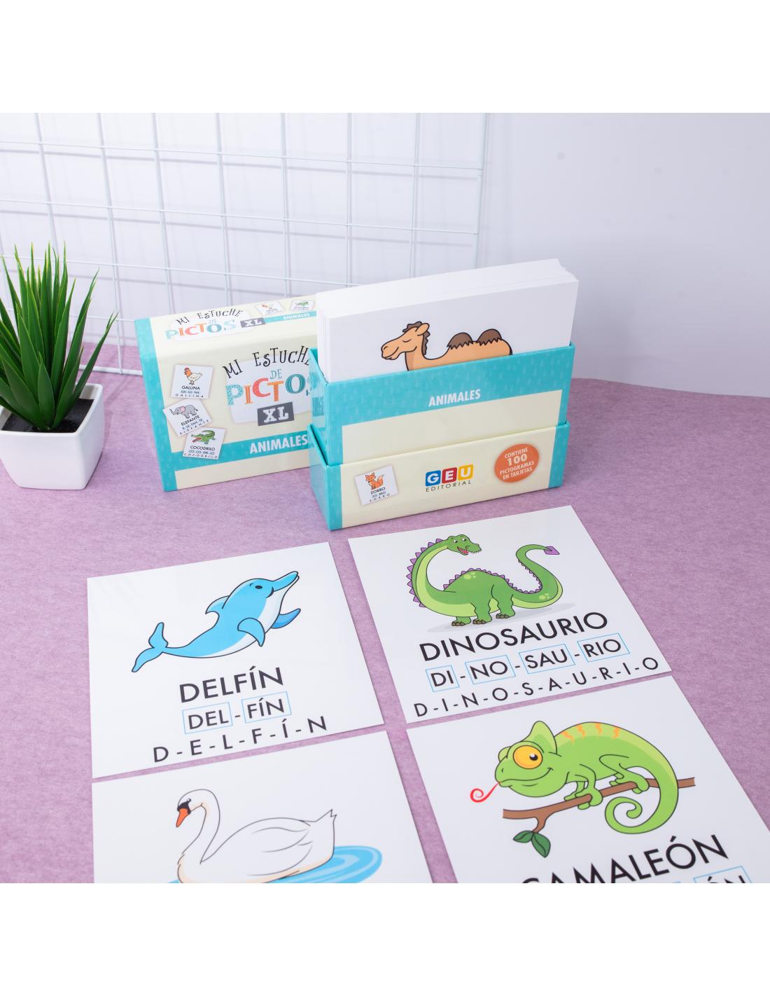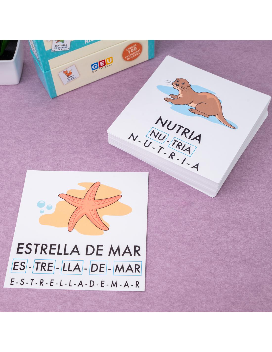 Pictogramas en formato tarjeta de 15 x 15 cm, con palabras en letra mayúscula, silabeadas y letra a letra con multitud de usos, tanto individuales como grupales.