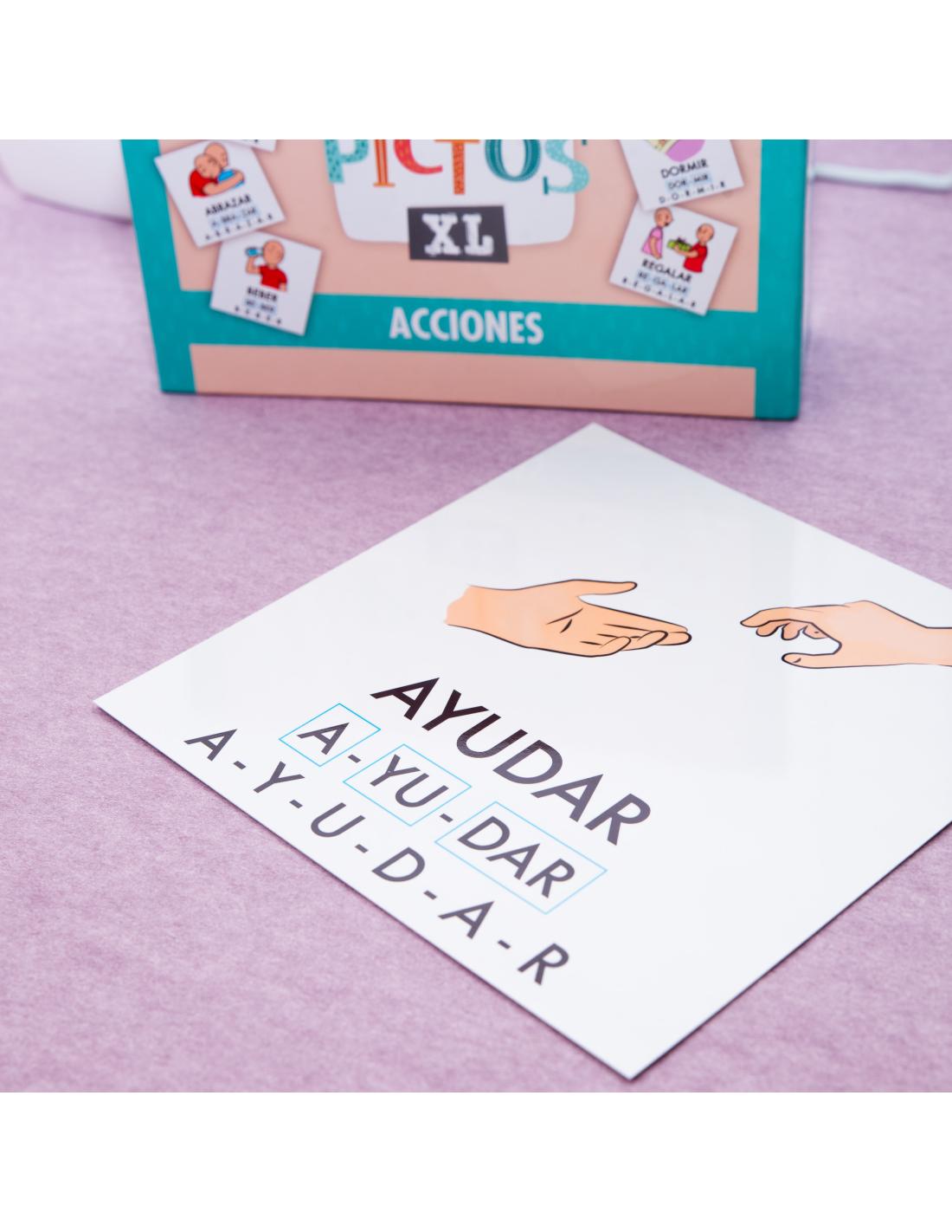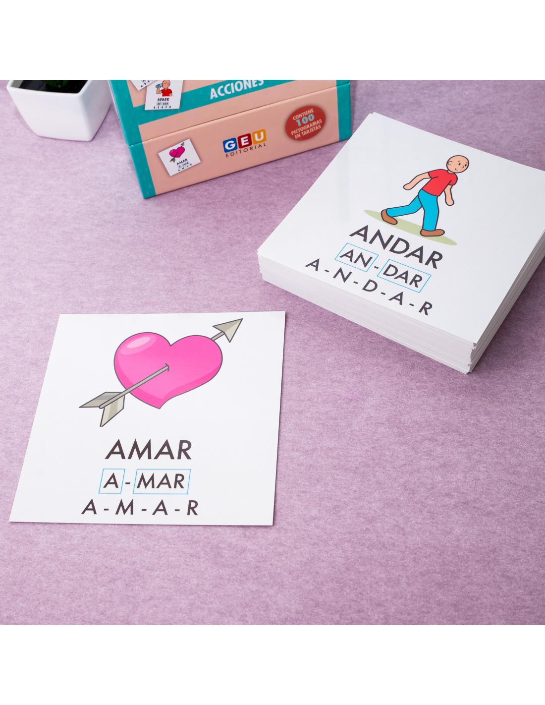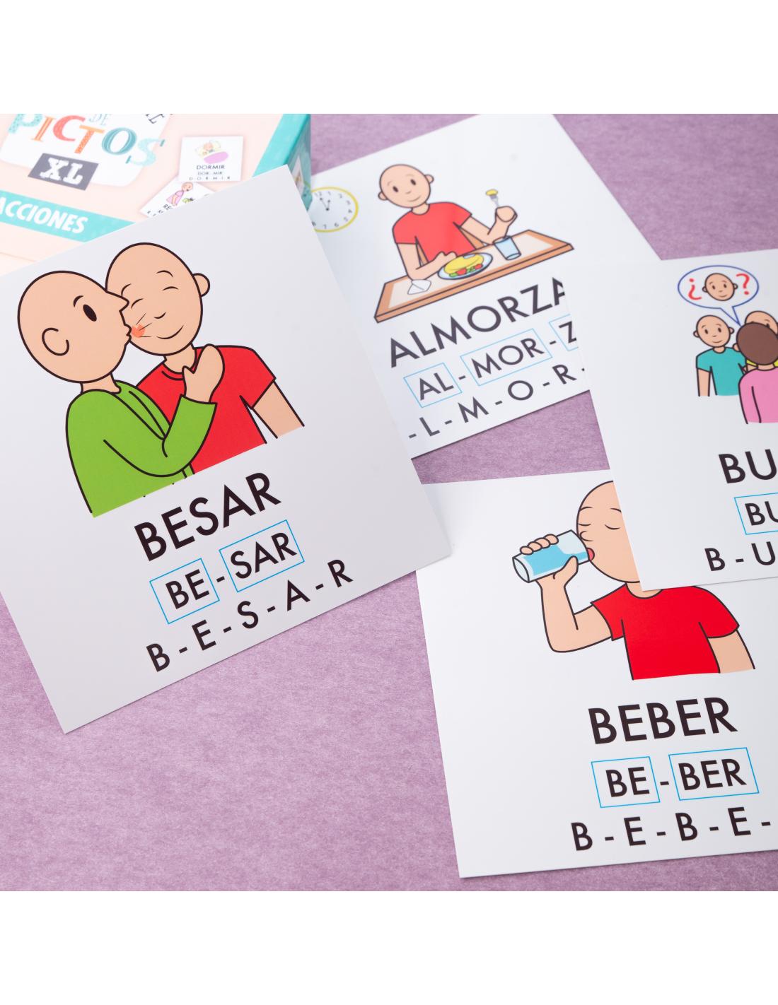 Cada tarjeta presenta pictogramas que representan acciones cotidianas, ayudando a aprender las sílabas y expandir el vocabulario de forma entretenida.