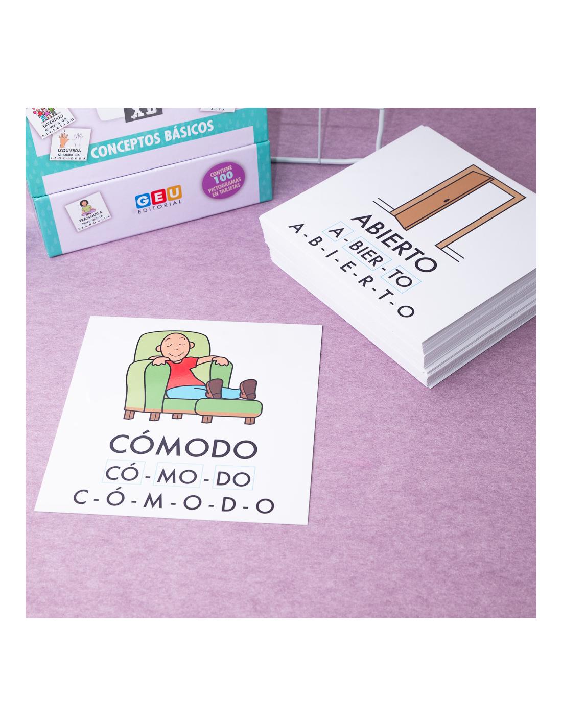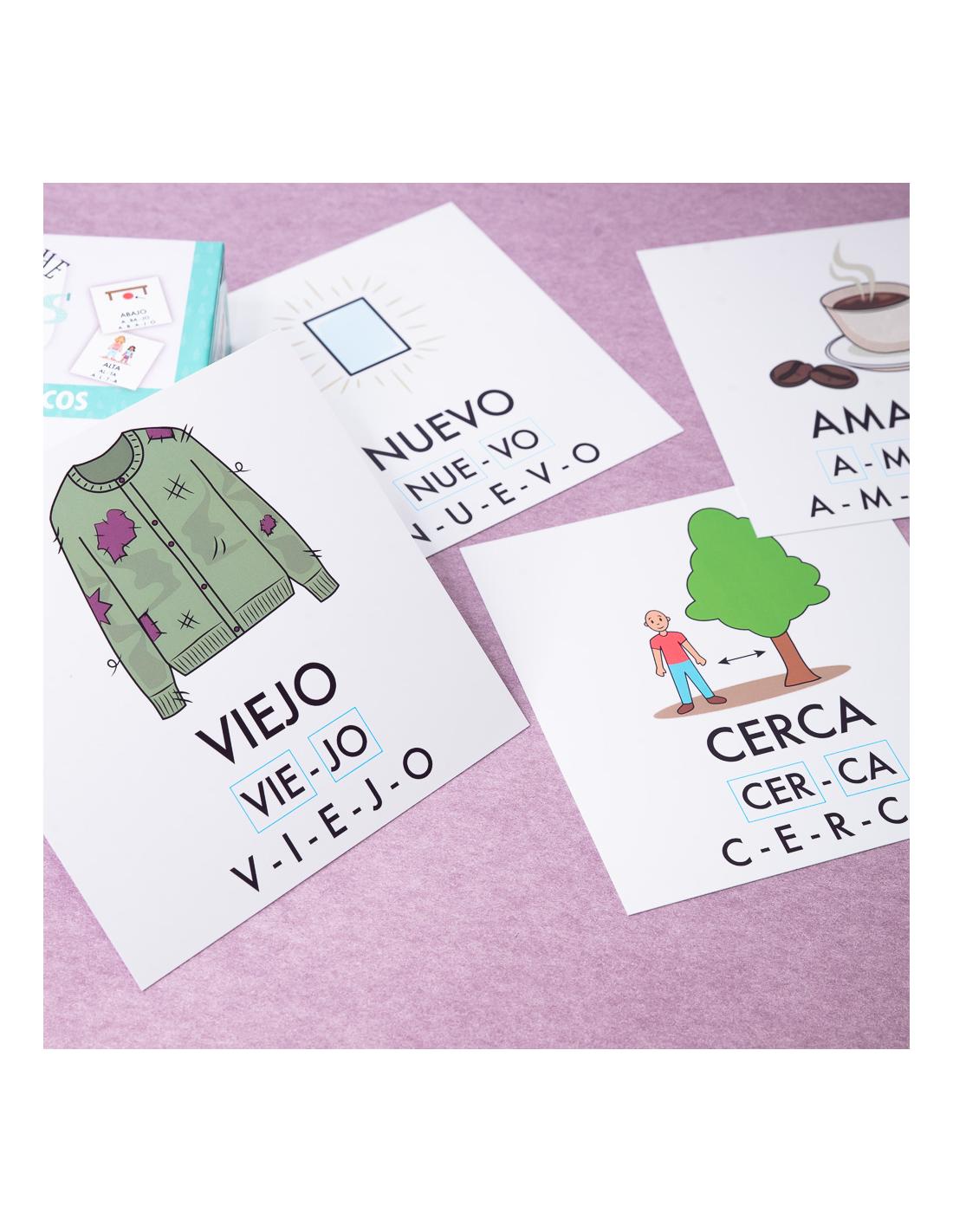 Estas tarjetas tienen el pictograma acompañado de la palabra en mayúscula completa, la misma palabra silabeada, y letra a letra, para trabajar la conciencia silábica con de cada palabra por separado, haciendo sencilla la complicada relación entre fonema-grafema.