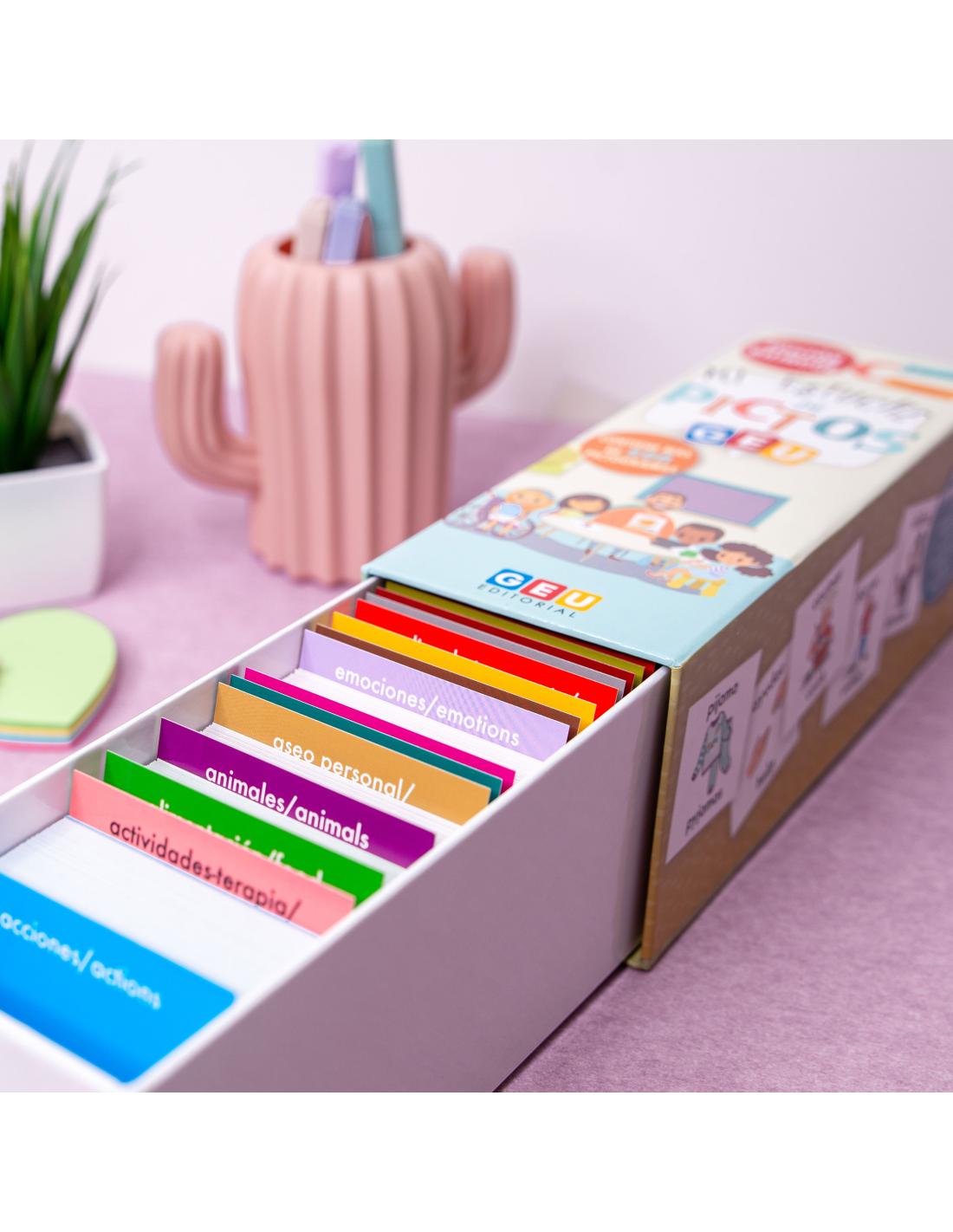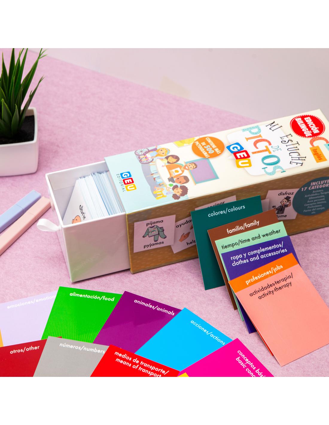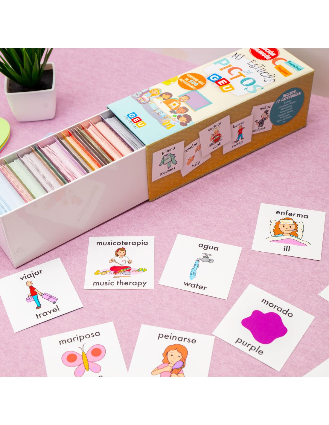 Con 500 tarjetas didácticas plastificadas y clasificadas en 17 categorías de pictogramas, desde ropa hasta acciones cotidianas, este juego ofrece una amplia variedad temática para un aprendizaje completo y divertido en español e inglés.