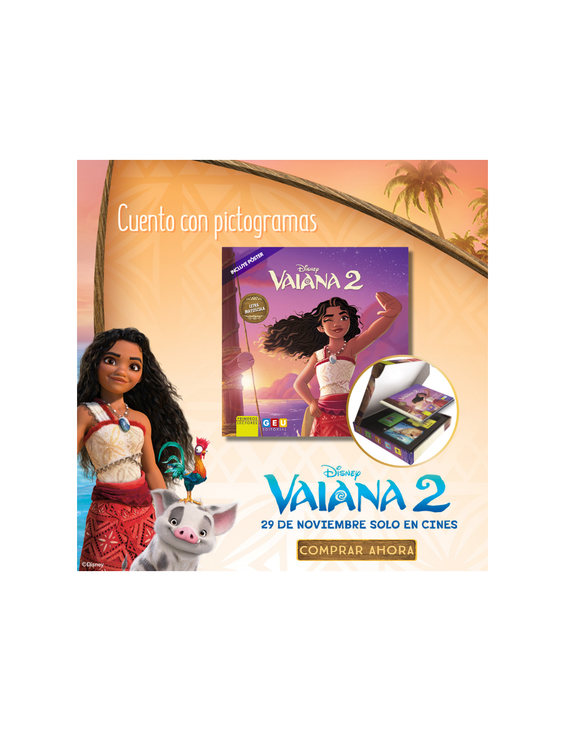 ★ Contenido de la caja. Incluye el cuento de Vaiana 2 en letra mayúscula, las tarjetas con pictogramas, las tarjetas con ilustraciones del cuento para construir frases y un fantástico póster a doble cara.