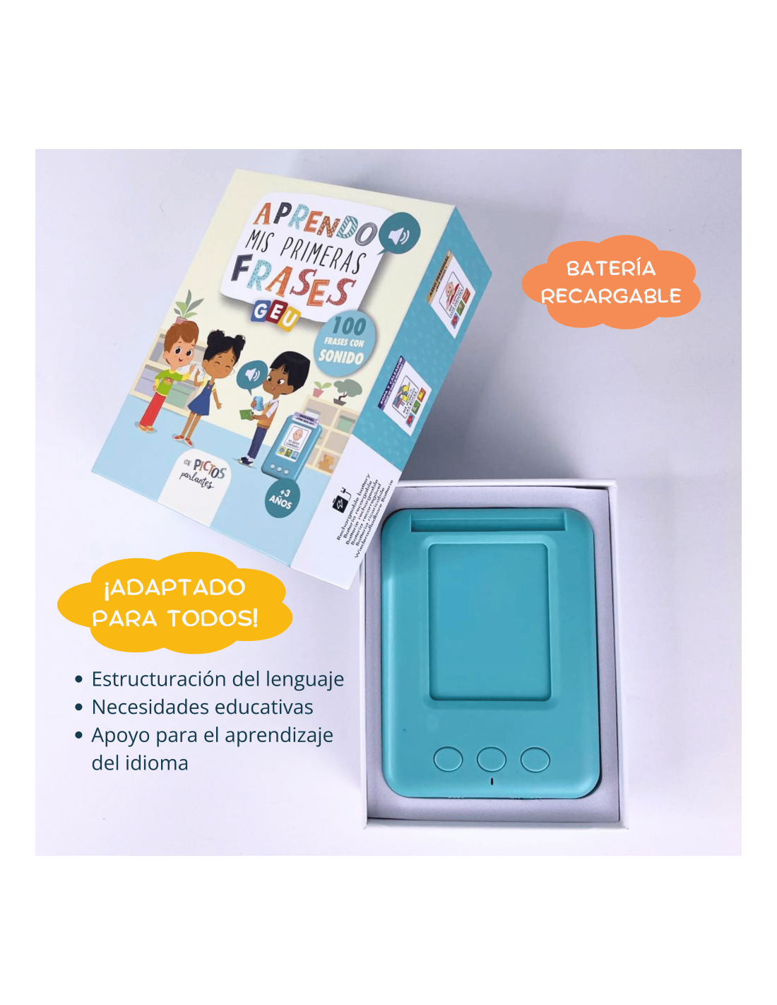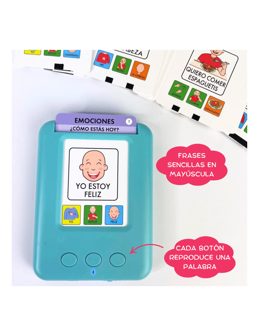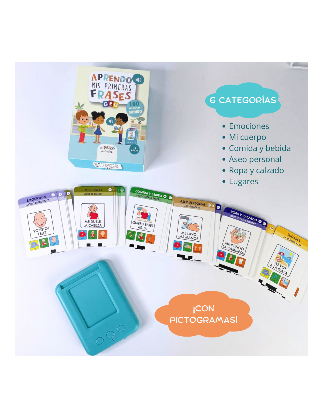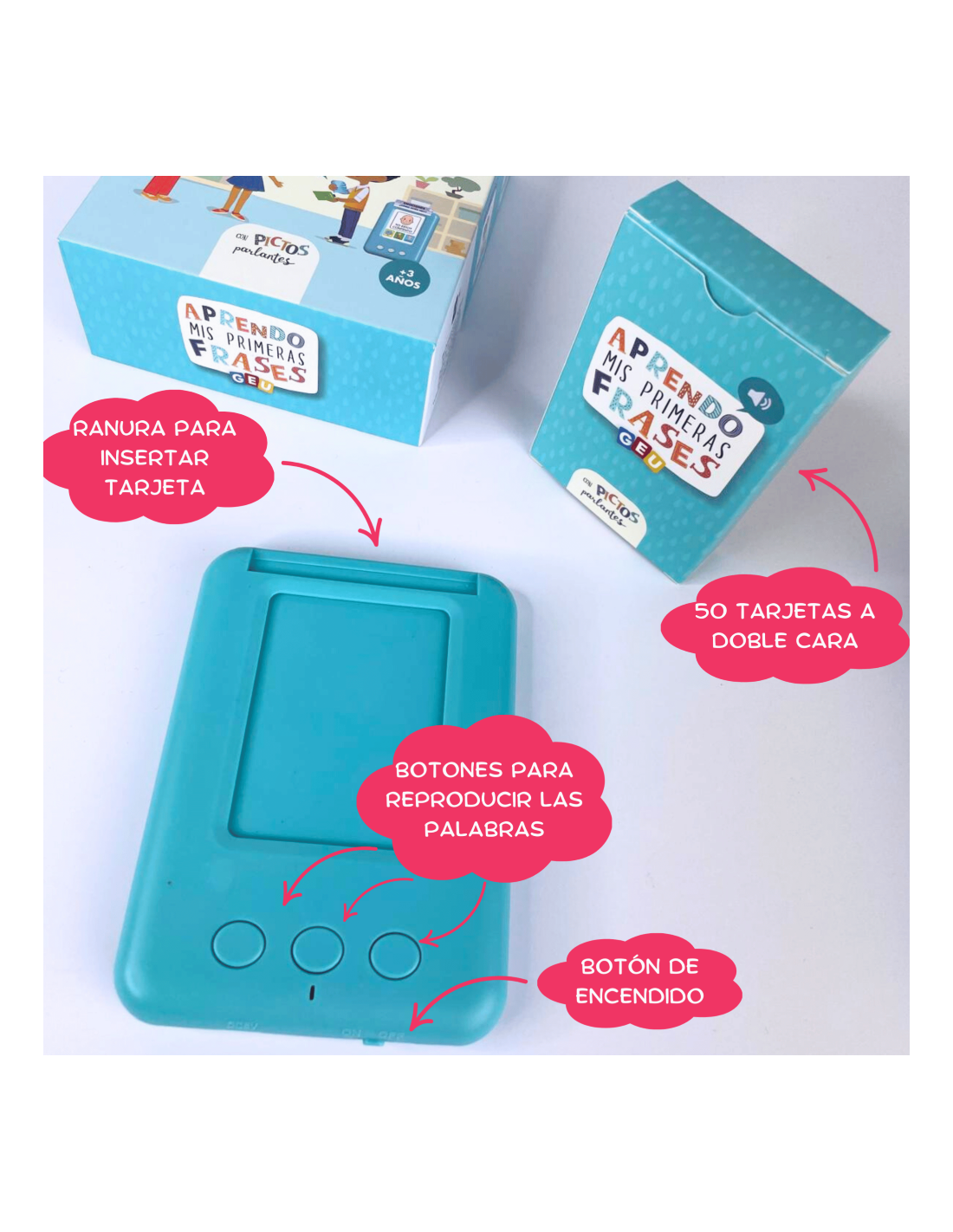 El dispositivo sonoro cuenta con 3 botones que reproducen el sonido de cada palabra, permitiendo a los niños practicar frases de forma autónoma y dinámica. Incluye 50 tarjetas a doble cara que ofrecen 100 frases sencillas acompañadas de pictogramas claros, facilitando la asociación visual y auditiva con ejemplos prácticos como "Yo estoy feliz".