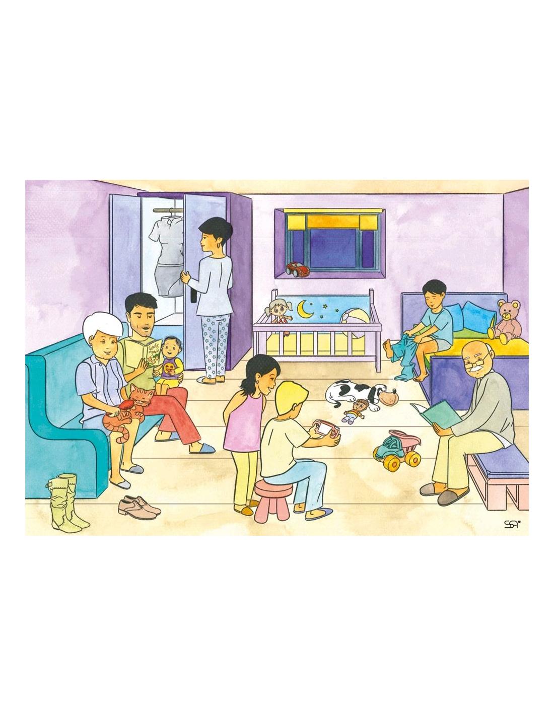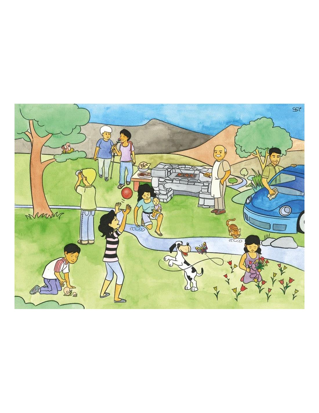 Las láminas están diseñadas de forma que el alumno pueda trabajar la expresión oral y la estructuración de frases en base a las acciones que realizan los diferentes personajes (papá, mamá, el abuelo, la abuela...). En cada escena se desarrollan acciones cotidianas que ayudan al niño a sentirlas cercanas.