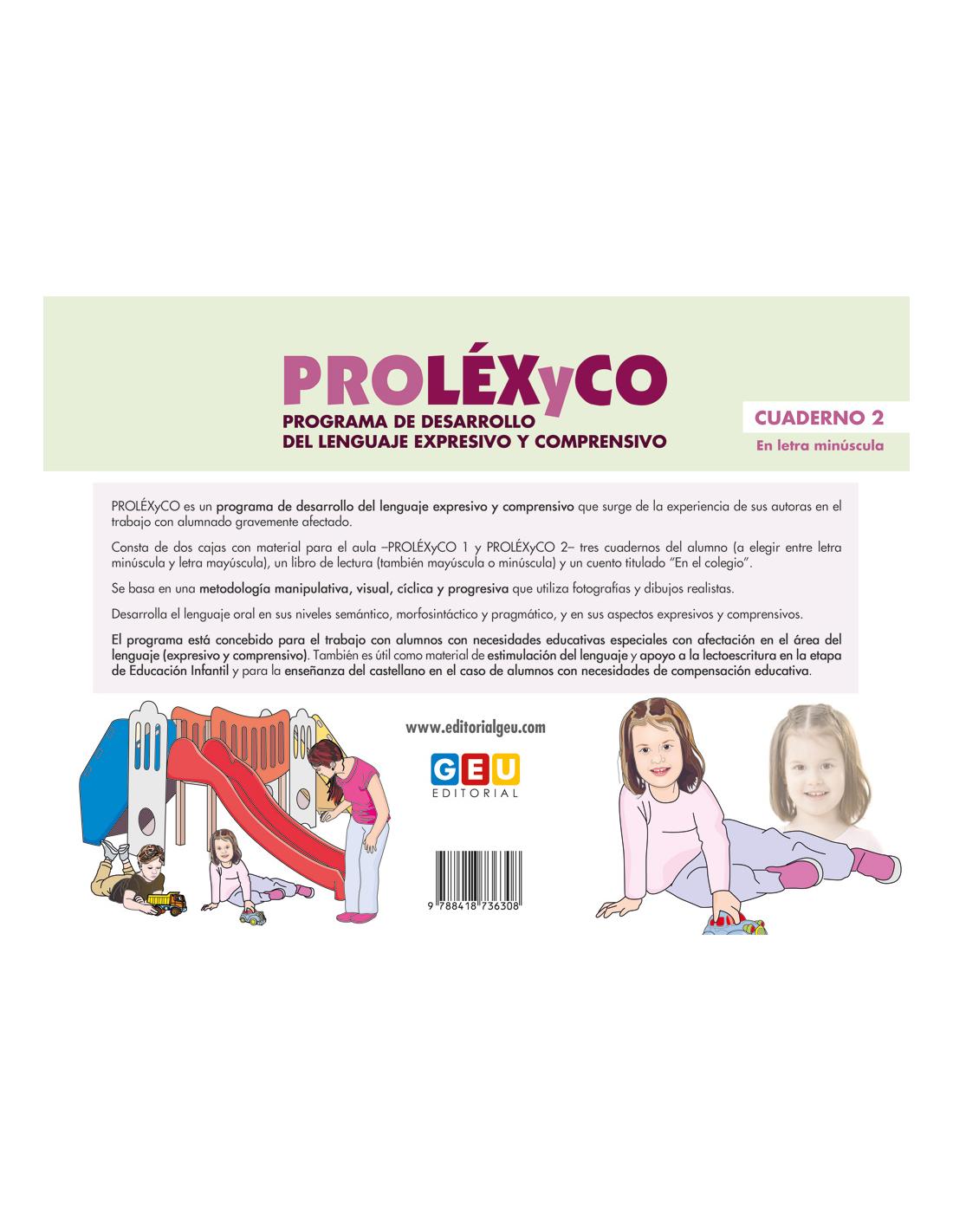 Consta de dos cajas con material para aula -PROLÉXYCO 1 y PROLÉXYCO 2- tres cuadernos del alumno ( a elegir entre letra minúscula y letra mayúscula), un libro de lectura (también mayúscula a minúscula) y un cuento titulado "En el colegio".