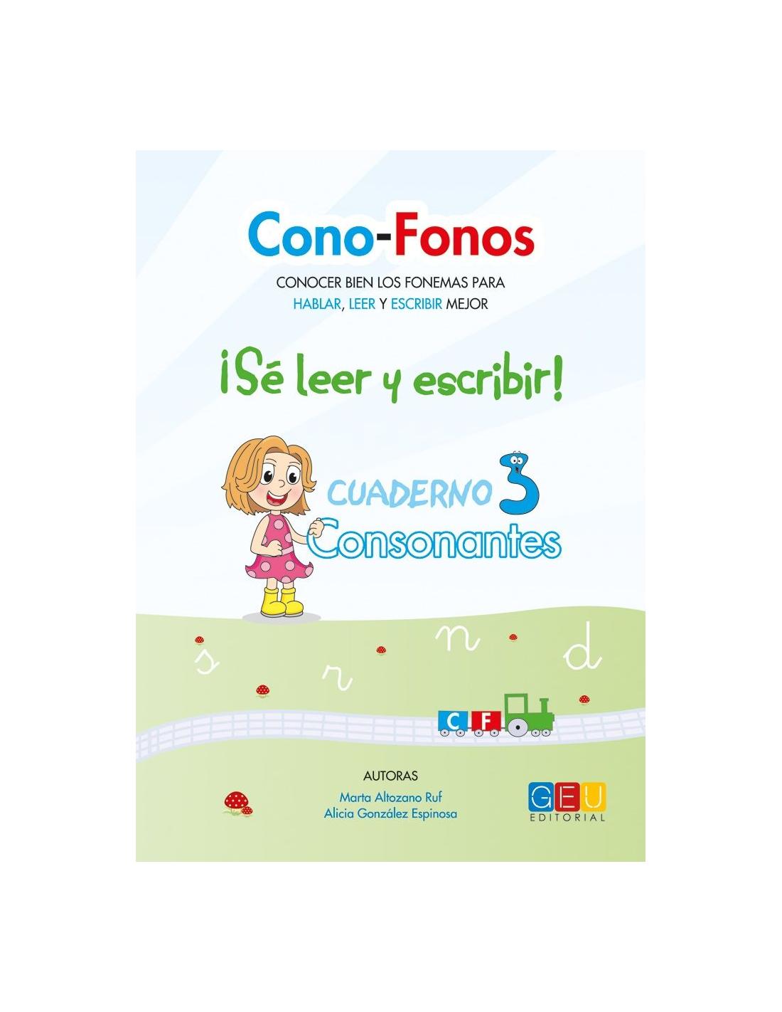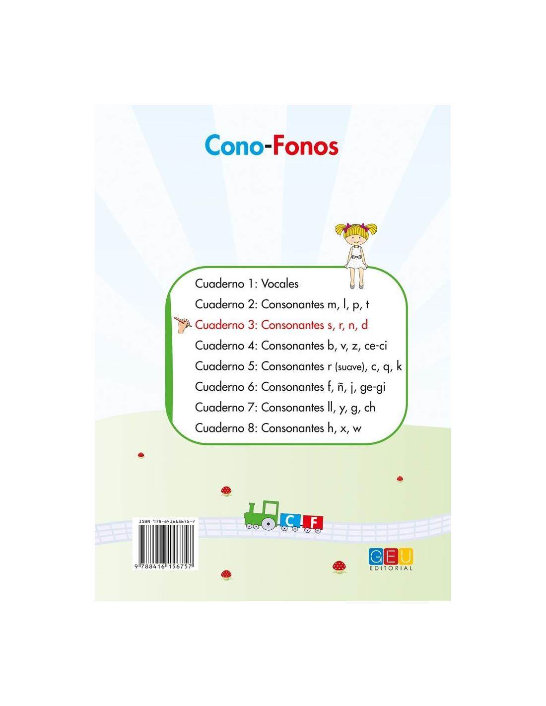Cono-Fonos 3: ¡Sé leer y escribir! Cuaderno 3: Consonantes s, r, n, d, forma parte de una colección de 8 cuadernos de enseñanza-aprendizaje de la lectoescritura, mediante una secuencia acumulativa de fonemas, onomatopeyas, apoyo articulatorio y grafemas.