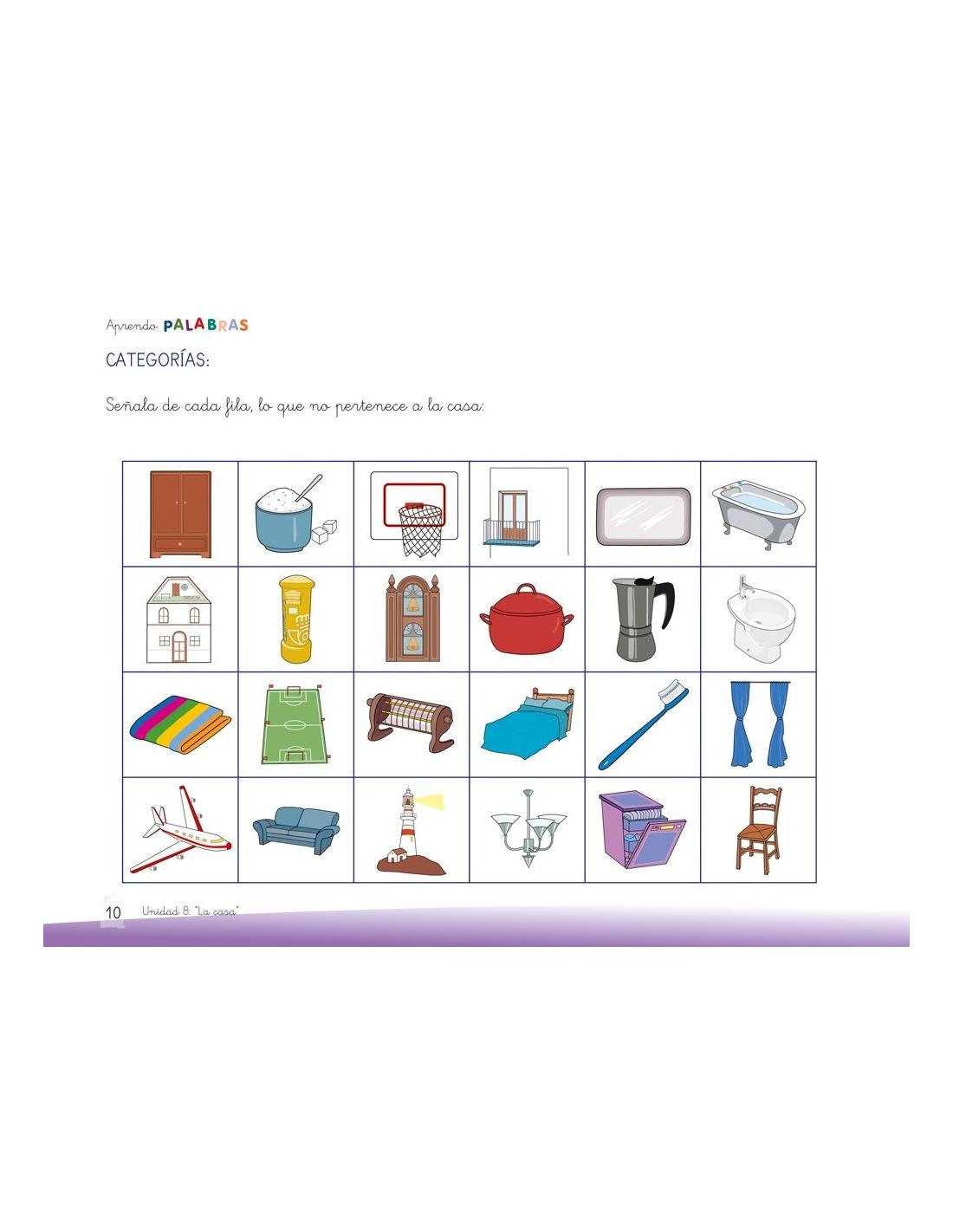Es un material fácil de usar por los más pequeños, que trabaja en completas unidades didácticas los centros de interés más importantes (colegio, cuerpo, animales, casa, verano, etc.), englobando el aprendizaje del vocabulario mediante actividades de conciencia fonológica, definiciones, categorías, morfosintaxis, etc.