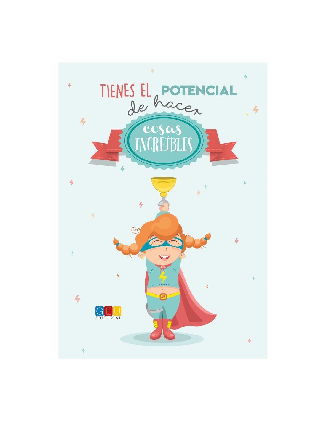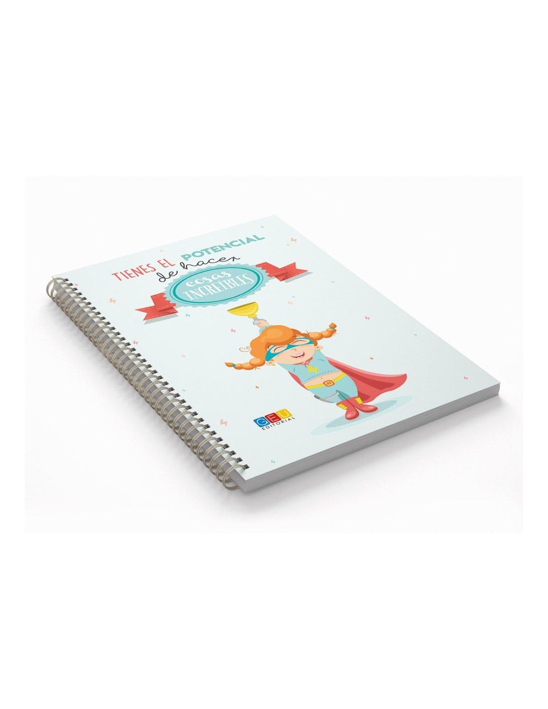 Libreta de tapa blanda en formato A5 con la frase “Tienes el potencial de hacer cosas increíbles”. La ilustración de la libreta tiene como protagonista a una niña superheroína.