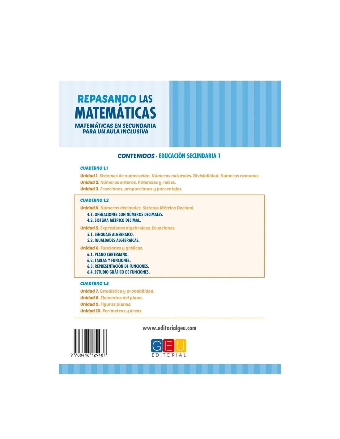 Repasando las matemáticas 1.2 Secundaria es el segundo cuaderno de la colección, orientado al primer curso de la ESO (Educación Secundaria Obligatoria). Se trata de un material elaborado con el objetivo de reforzar la asignatura de matemáticas con actividades amenas que siguen los contenidos del Currículo Oficial del curso.
