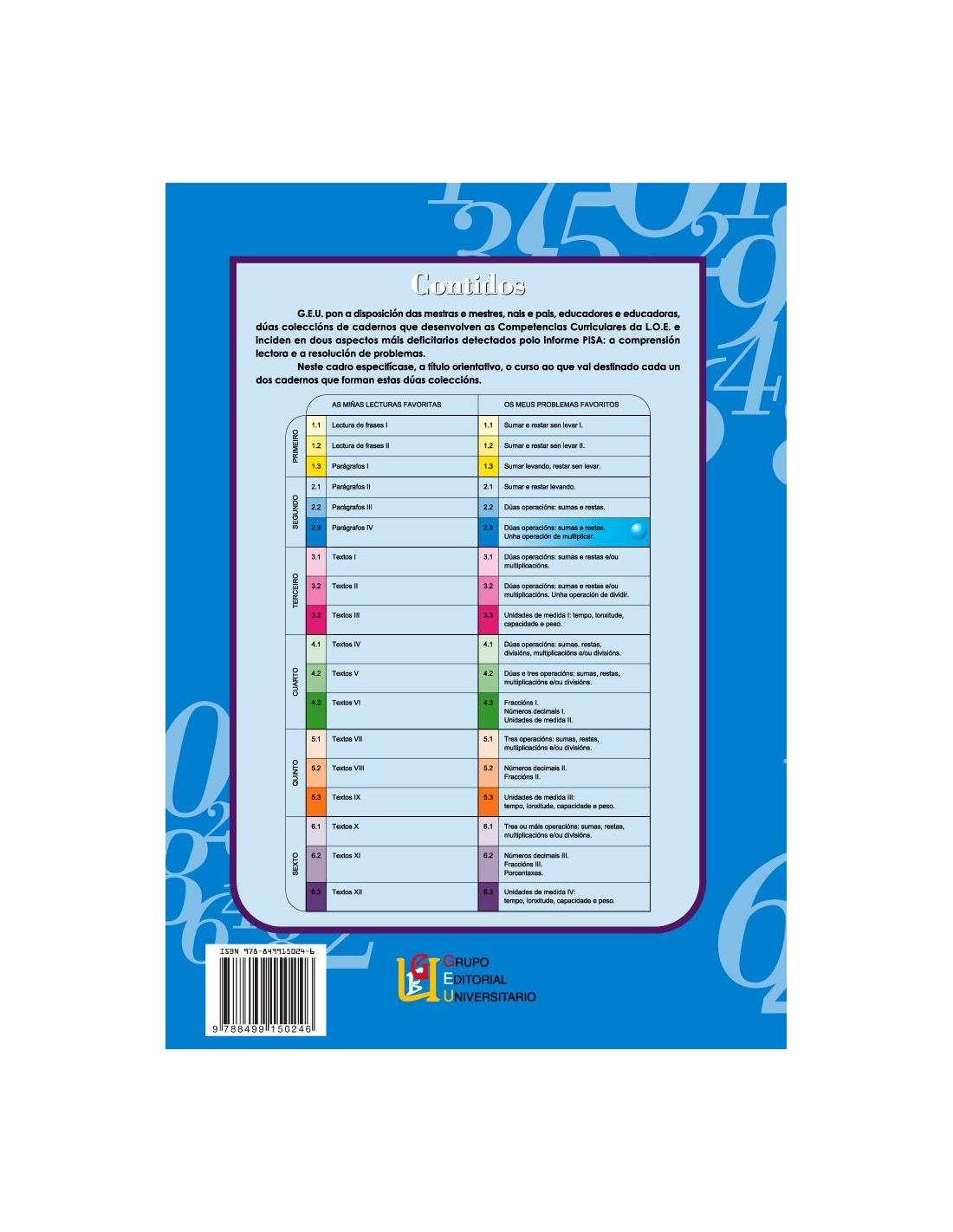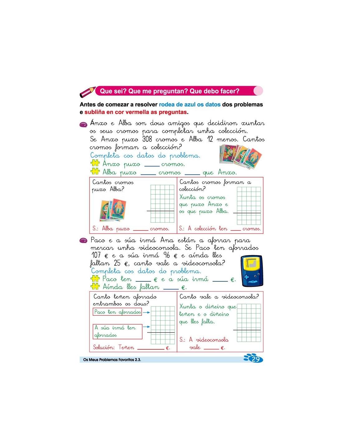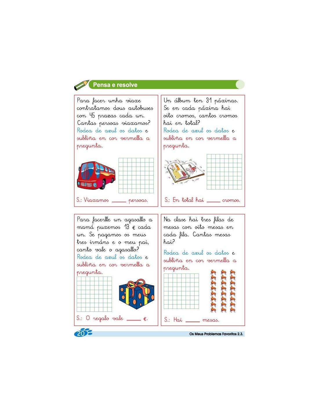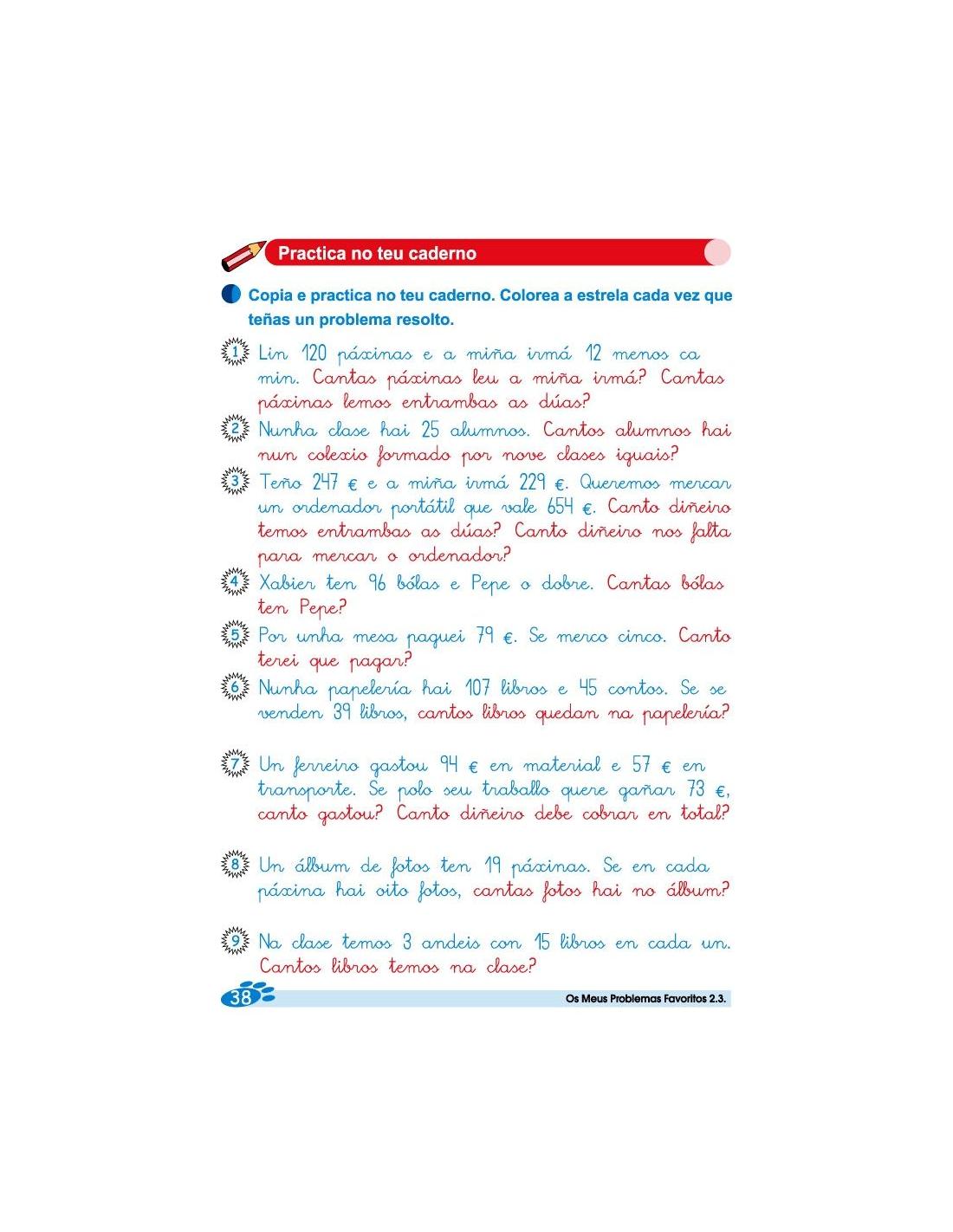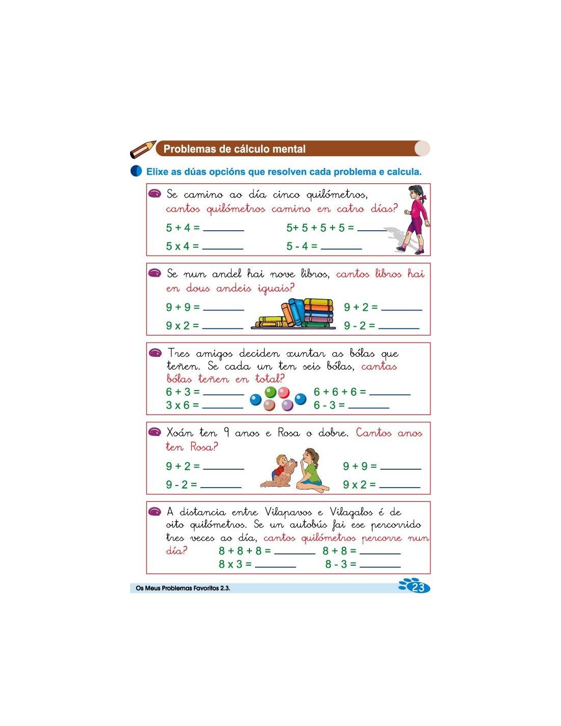 Os meus problemas favoritos 2.3 corresponde a 2º de Primaria y es la traducción en gallego, es una colección de 18 cuadernos de problemas, que parten de situaciones cotidianas con estrategias matemáticas que facilitan la resolución de problemas.