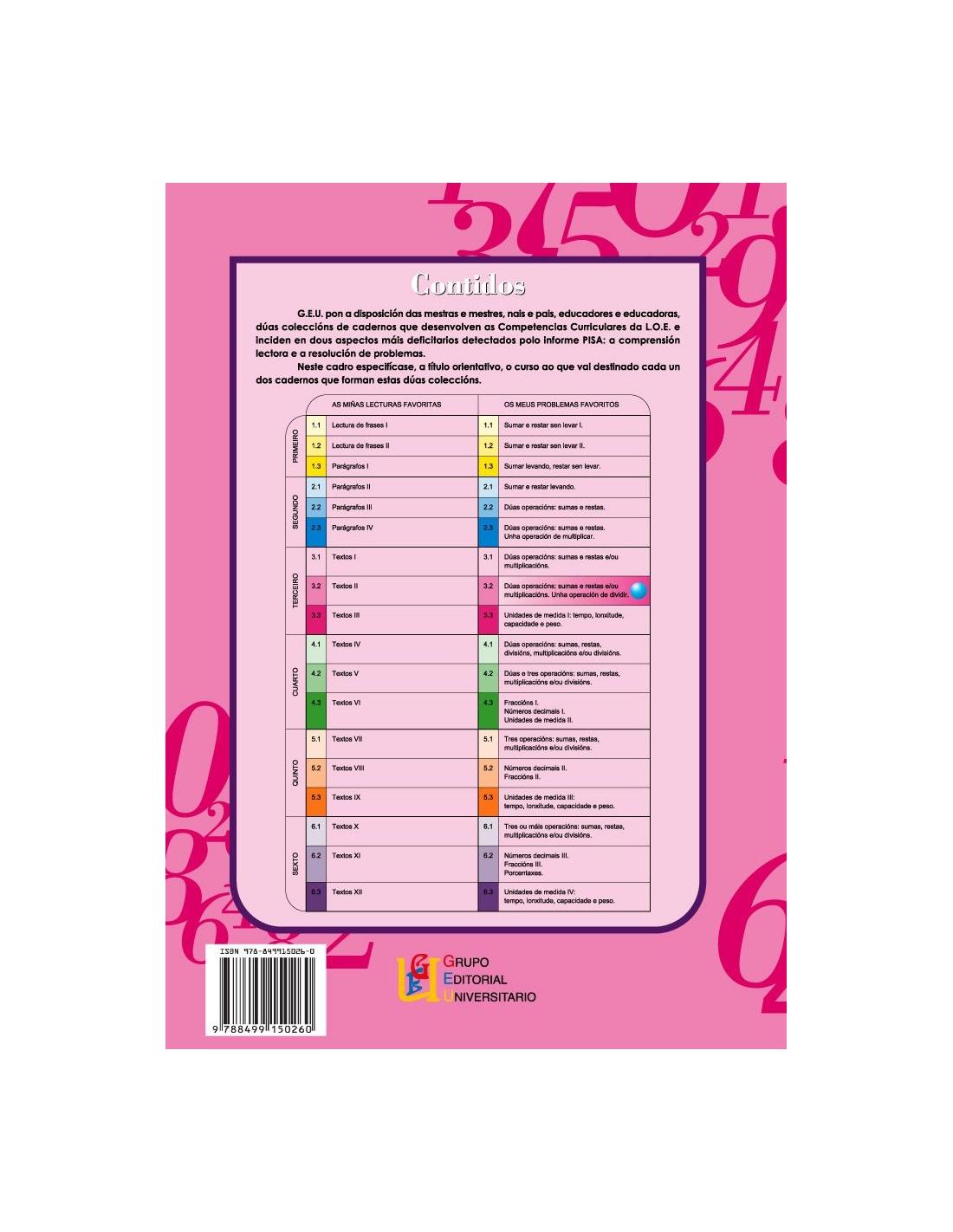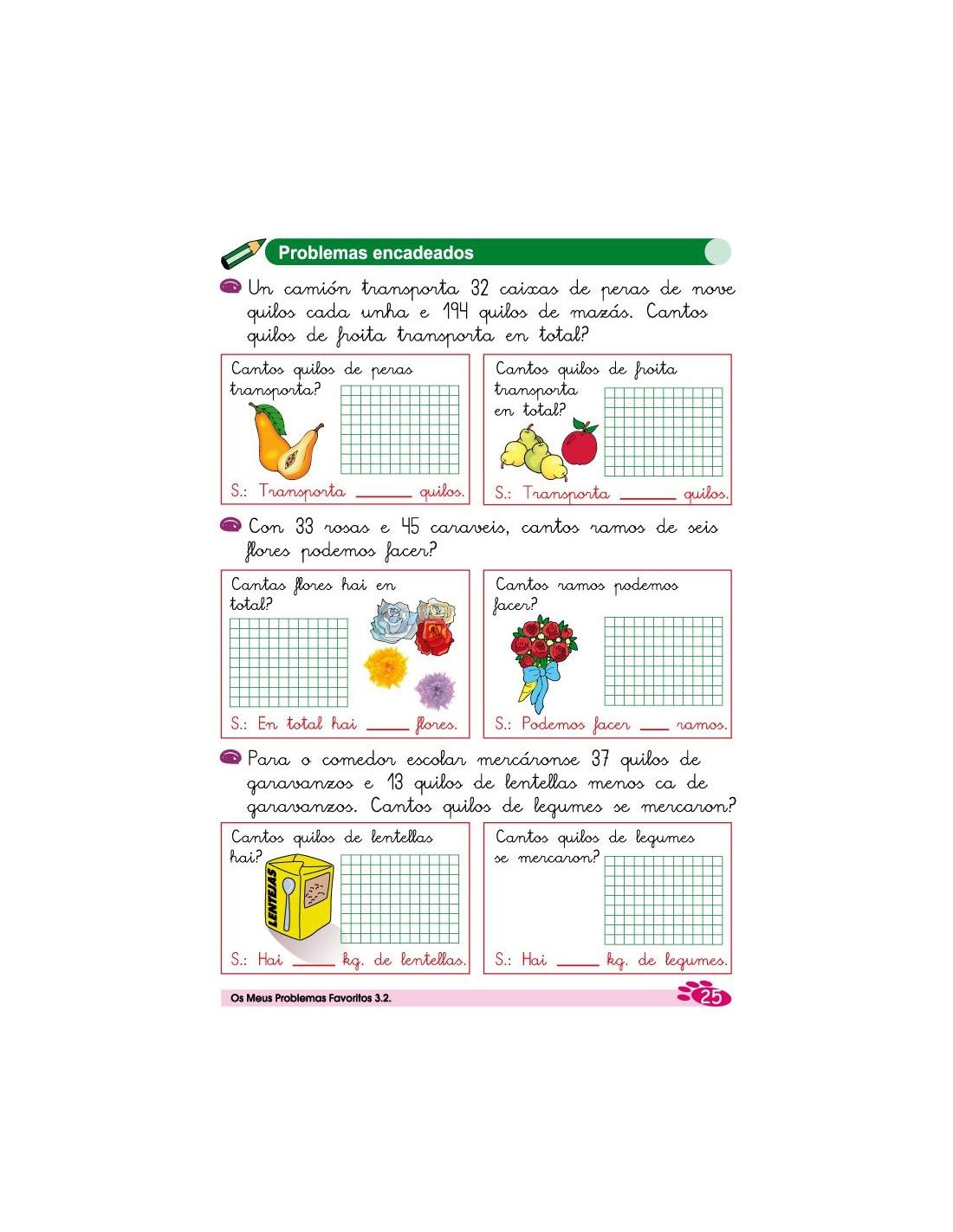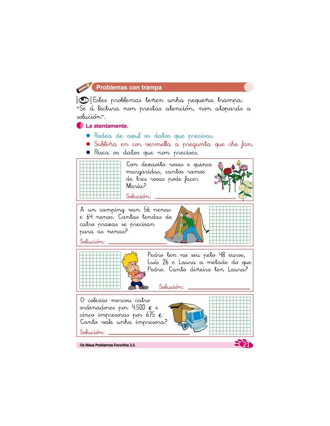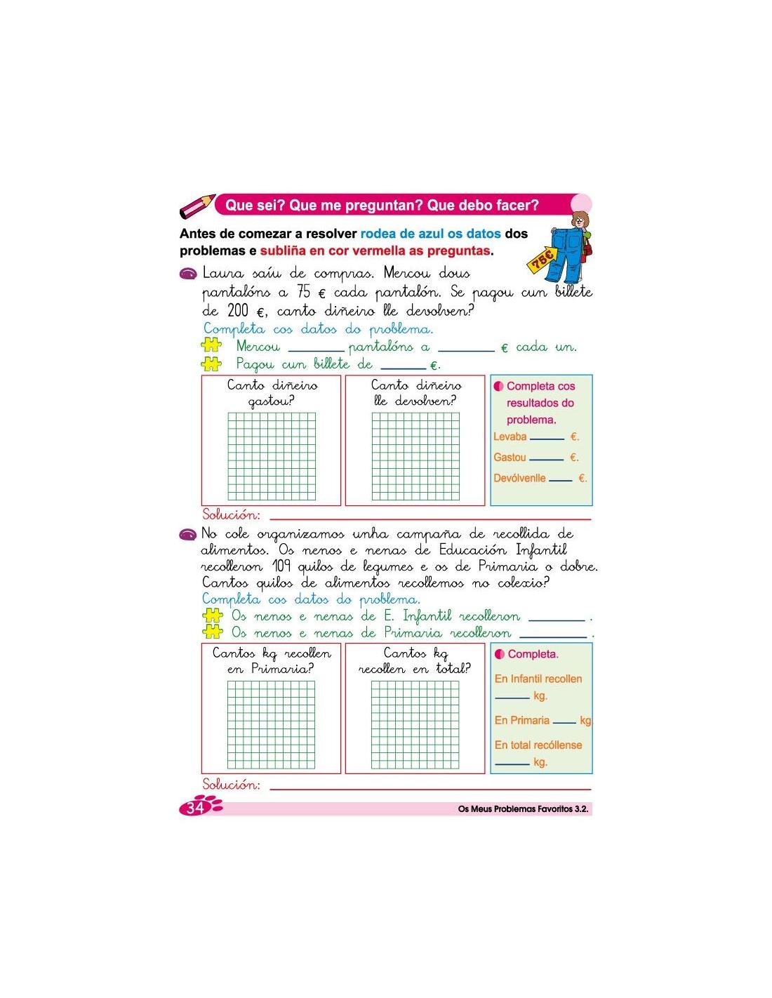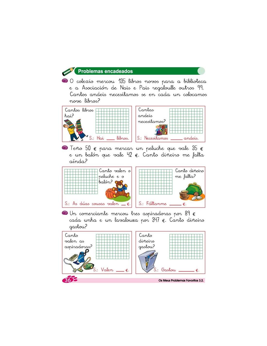 Os meus problemas favoritos 3.2 corresponde a 3º de Primaria y es la traduccion en gallego de la colección "Mis Problemas Favoritos", es una colección de 18 cuadernos de problemas, que parten de situaciones cotidianas con estrategias matemáticas que facilitan la resolución de problemas. Están diseñados en una secuencia progresiva de primero a sexto de Educación Primaria.