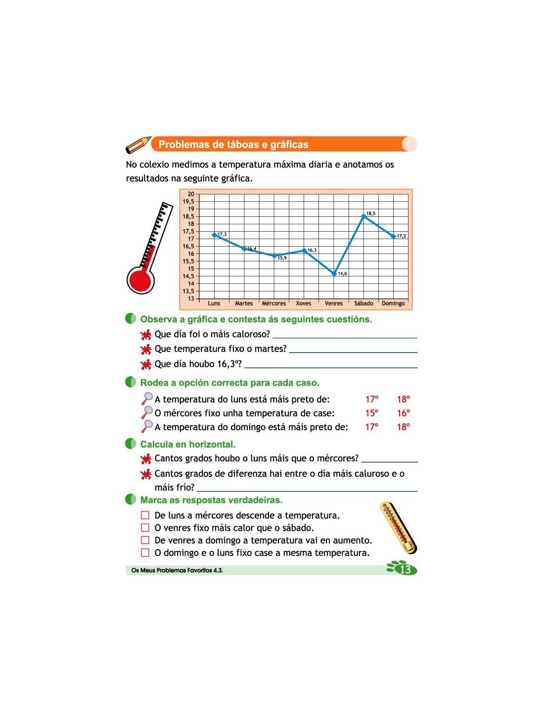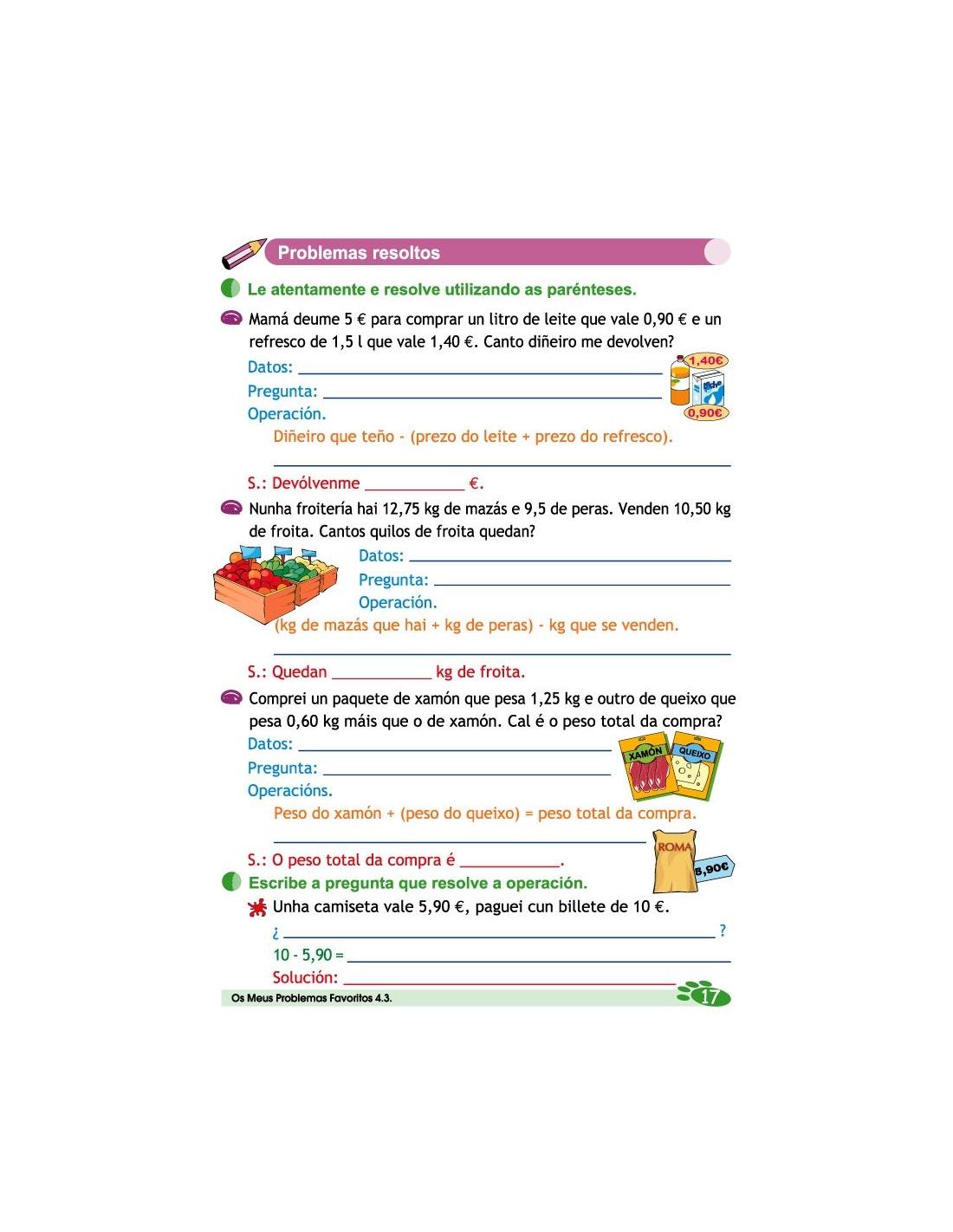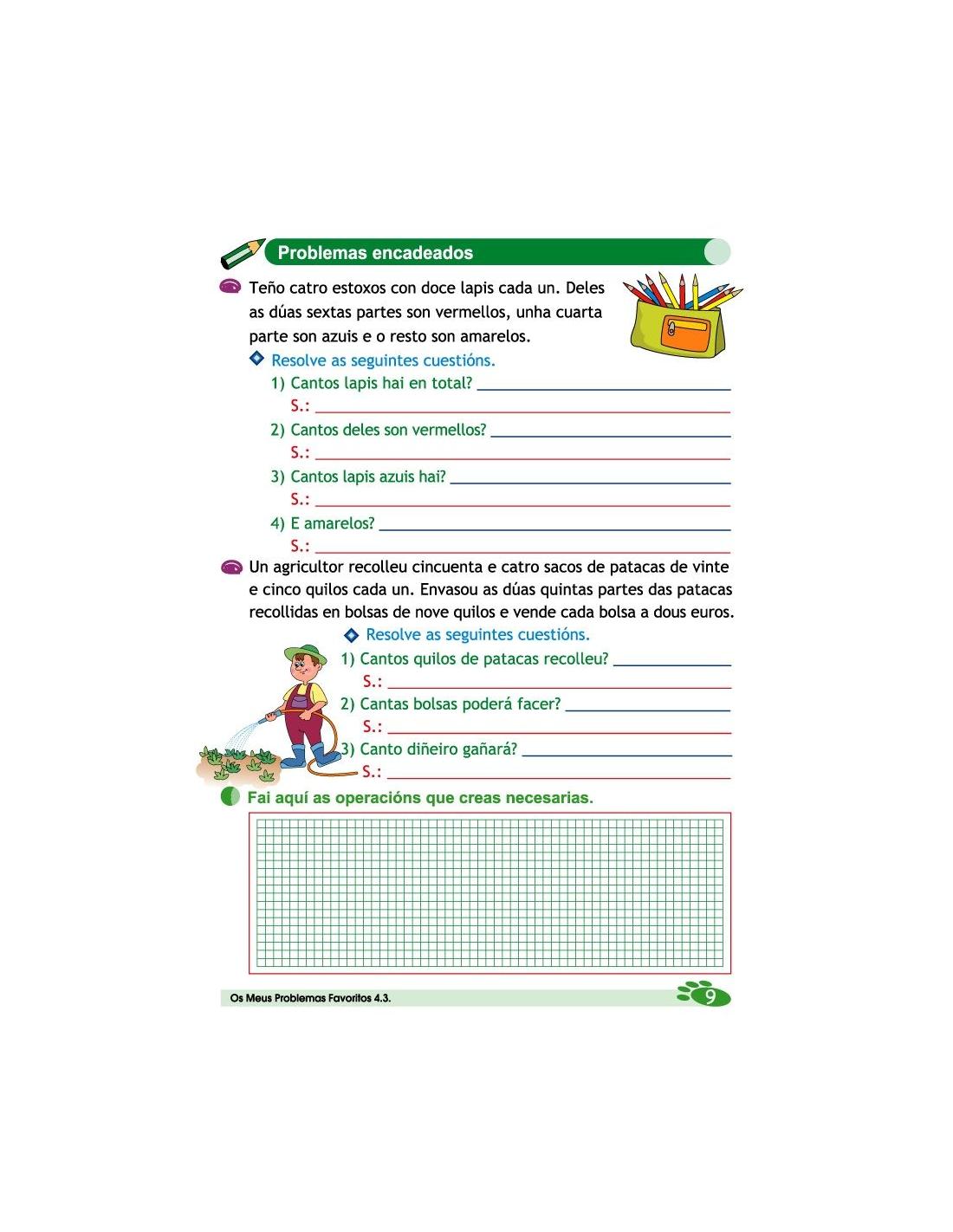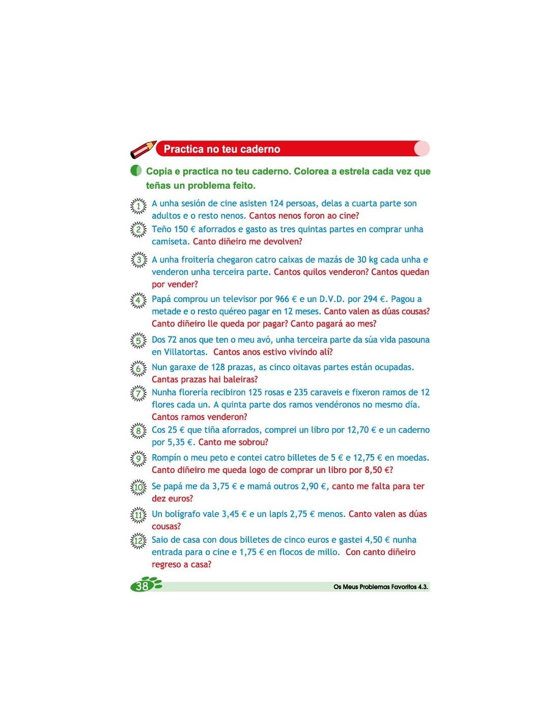 Os meus problemas favoritos 4.3 corresponde a 4º de Primaria y es la traducción en gallego de la colección "Mis Problemas Favoritos", es una colección de 18 cuadernos de problemas, que parten de situaciones cotidianas con estrategias matemáticas que facilitan la resolución de problemas. Están diseñados en una secuencia progresiva de primero a sexto de Educación Primaria.