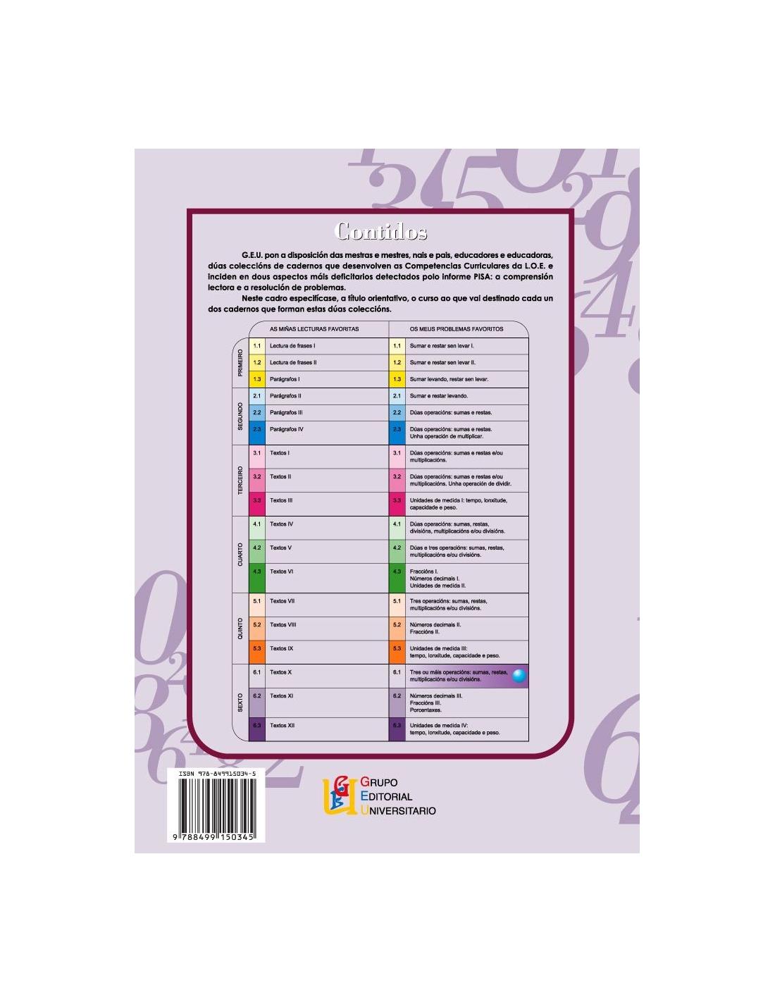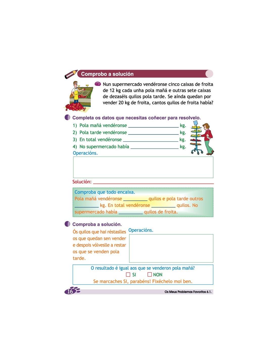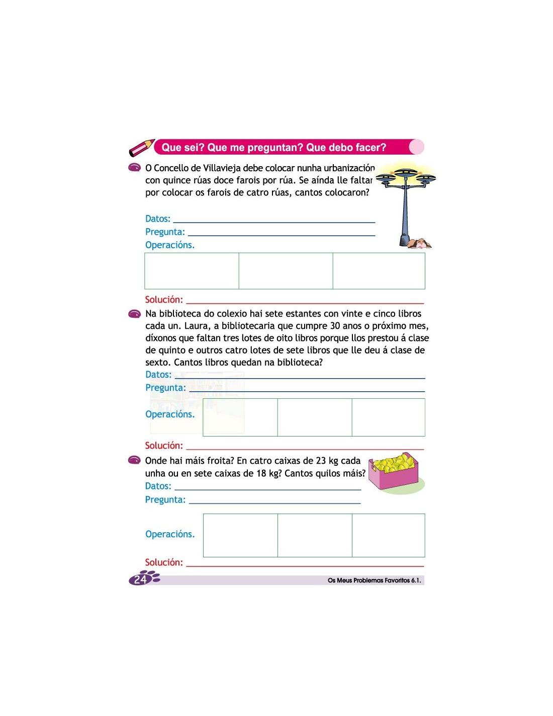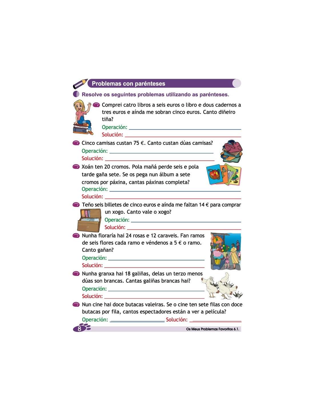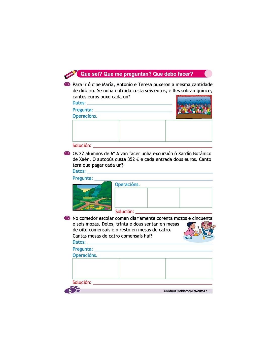 Os meus problemas favoritos 6.1 corresponde a 6º de Primaria y es la traduccion en gallego de la colección "Mis Problemas Favoritos", es una colección de 18 cuadernos de problemas, que parten de situaciones cotidianas con estrategias matemáticas que facilitan la resolución de problemas. Están diseñados en una secuencia progresiva de primero a sexto de Educación Primaria.