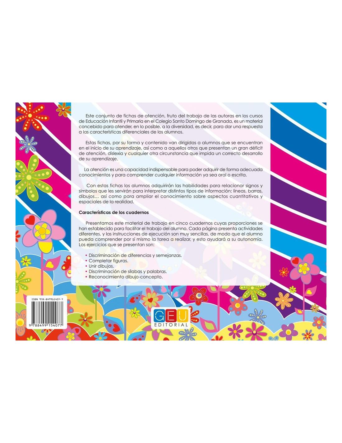 Desde la discriminación de diferencias y semejanzas hasta completar figuras y unir dibujos, cada actividad ha sido diseñada para estimular la atención y concentración de manera efectiva. Con ejercicios que abarcan la discriminación de sílabas y palabras, así como el reconocimiento de dibujos y conceptos, este libro ofrece un enfoque integral para mejorar las habilidades cognitivas de los niños.