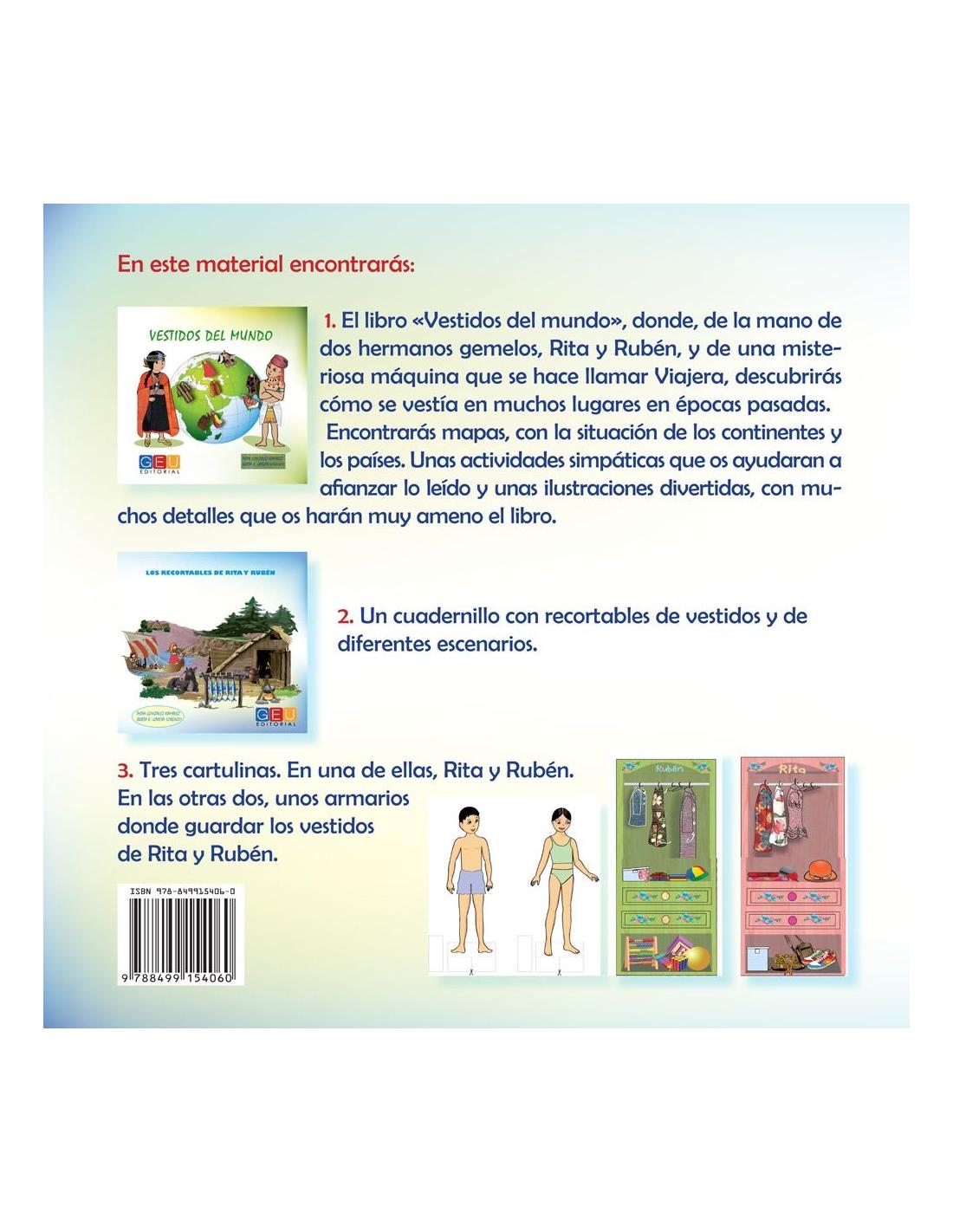 Este material va retractilado y contiene el libro Vestidos del mundo, donde, de la mano de sus protagonistas, se hace un recorrido por distintas épocas y pueblos para conocer cómo vestían. Lleva mapas, con la situación de los continentes y los países, y unas actividades divertidas para afianzar lo leído.