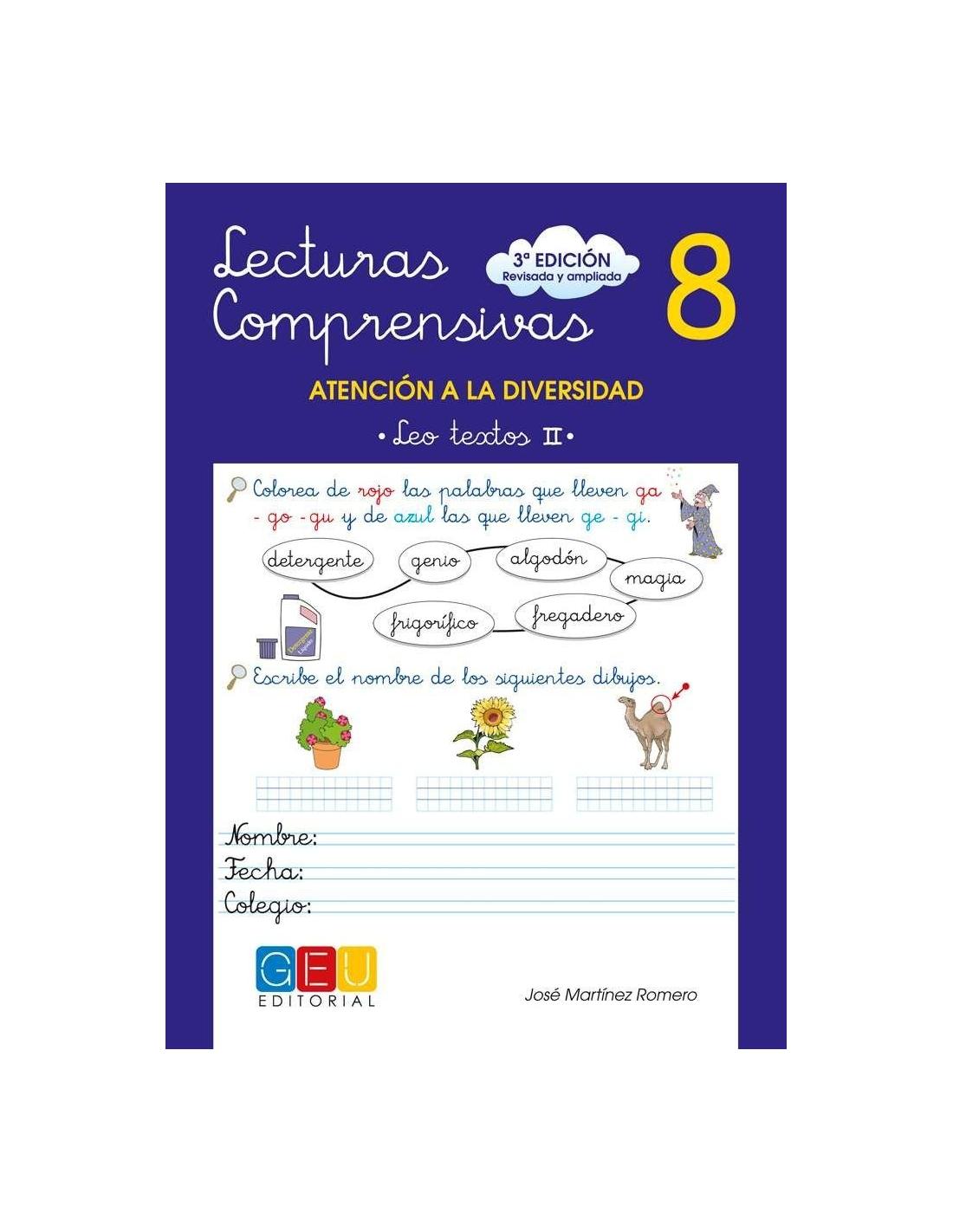 El cuaderno Lecturas comprensivas 08 incluye breves textos que el alumno deberá leer y, a posteriori, responder a las preguntas. Se trata de textos de hasta 250 palabras y de sencillas preguntas con respuesta concreta, como por ejemplo: “¿Quién es el personaje principal de la historia?” o “¿Qué estaba haciendo el protagonista cuando ocurrió tal cosa?”.