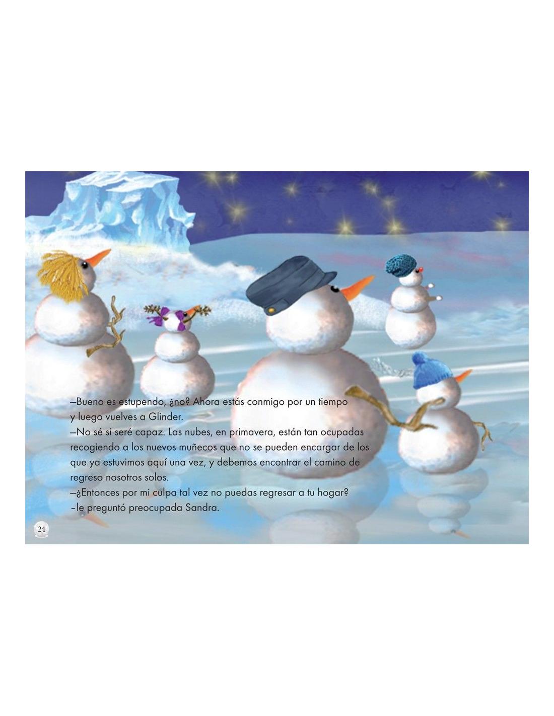 Déjate sorprender por este bello y mágico cuento que narra la historia de una niña llamada Sandra que está muy triste porque ha tenido que dejar su pueblo y a sus amigos, hasta que un día la niña decide construir un muñeco de nieve que termina cobrando vida y se hacen amigos. Descubre el mágico mundo de Glinder y qué ocurre cuando el invierno empieza a terminar y el calor se acerca cada vez más.