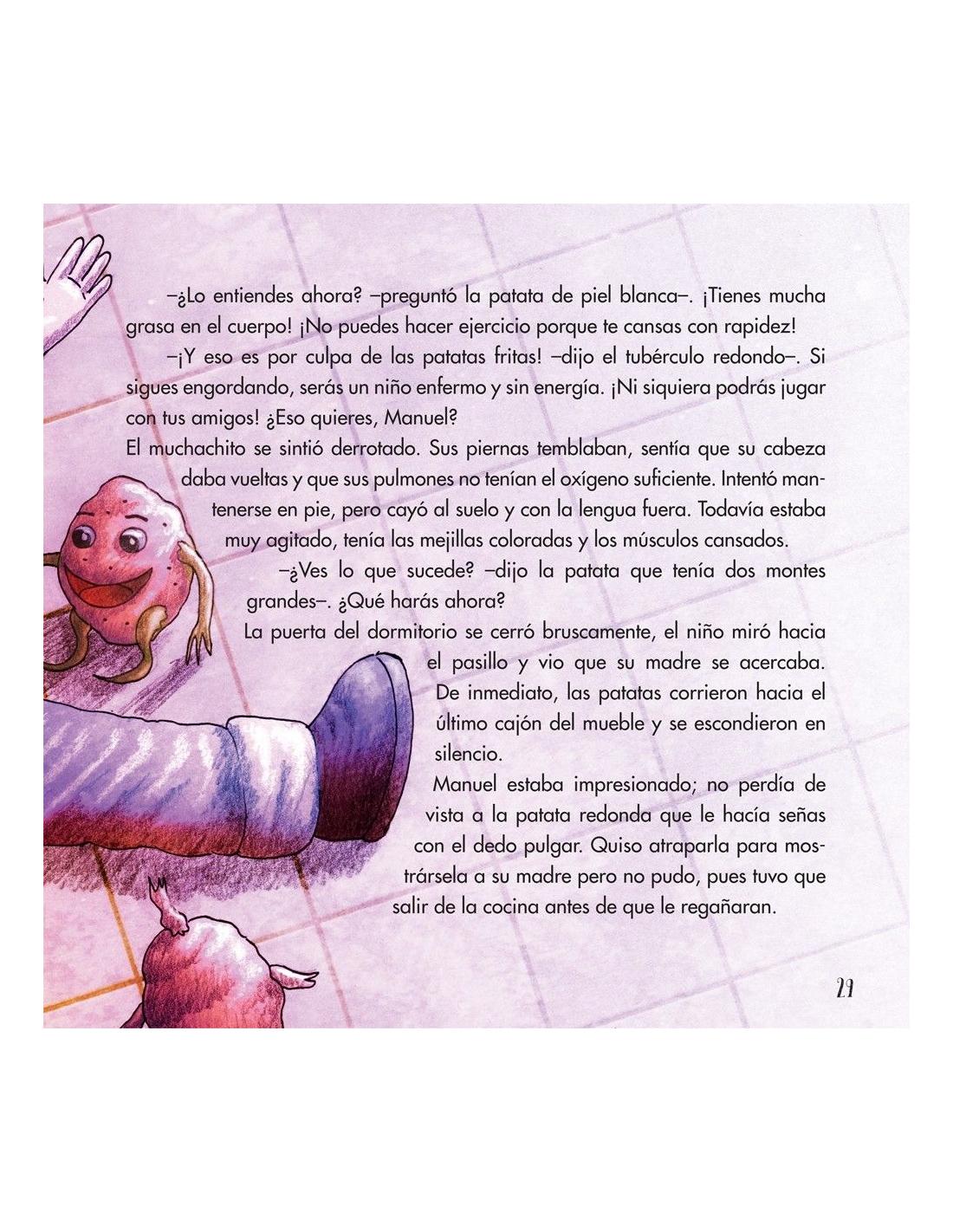 Manuel piensa que está comiendo bien, y espera impaciente que su madre prepare el aceite caliente para freír las patatas. Sin embargo, un extraño ruido en la cocina despertará su atención y lo llevará a descubrir algo que jamás imaginó: ¡Las patatas pueden hablar! ¿Cómo es posible? En la conversación, los nuevos amigos del muchacho tratarán de convencerlo para que evite una alimentación incorrecta. De esta forma, Manuel tendrá que valorar lo que es más importante para su salud y su futuro.