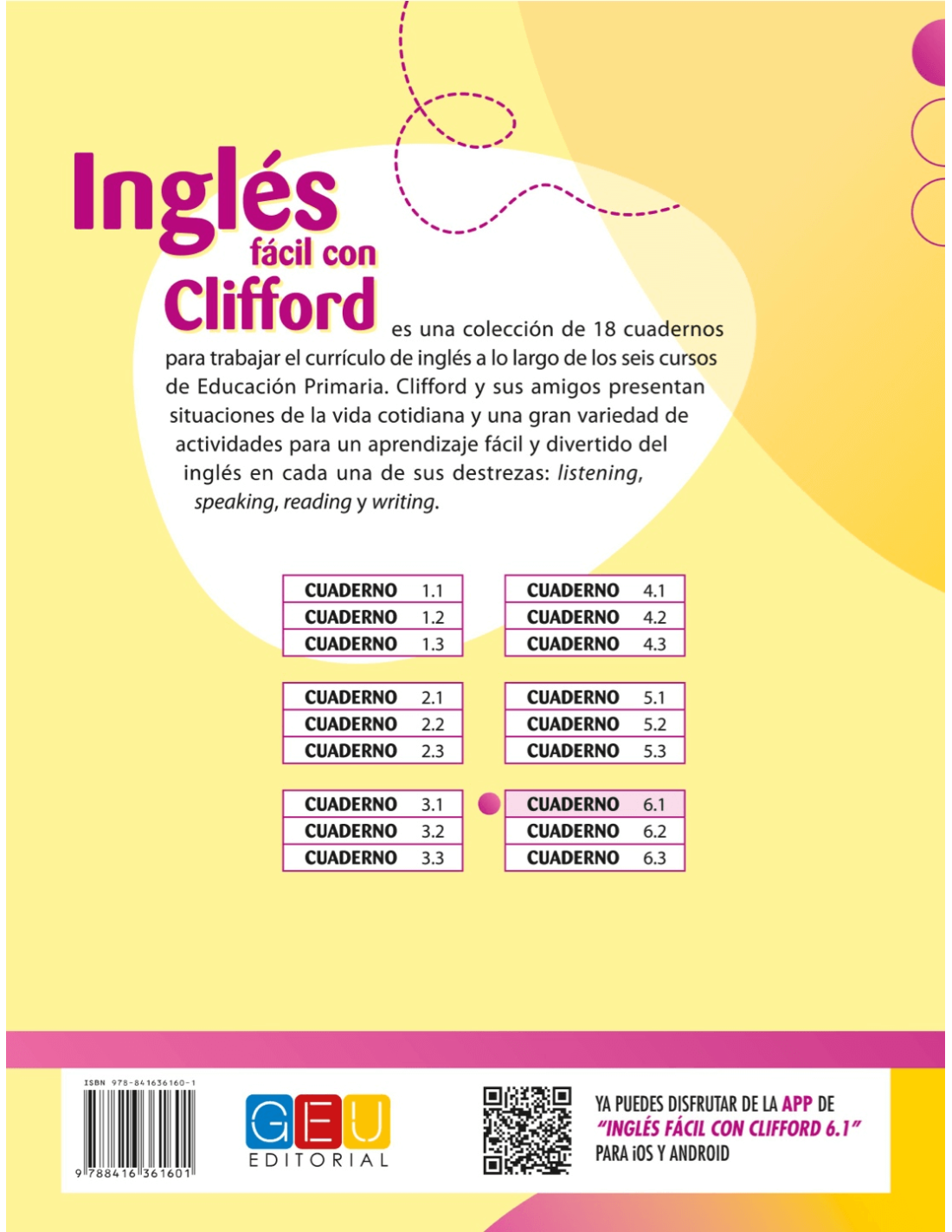Inglés fácil con Clifford 6.1 forma parte de una colección de cuadernos de repaso dirigida a estudiantes de 1º a 6º de Educación Primaria.