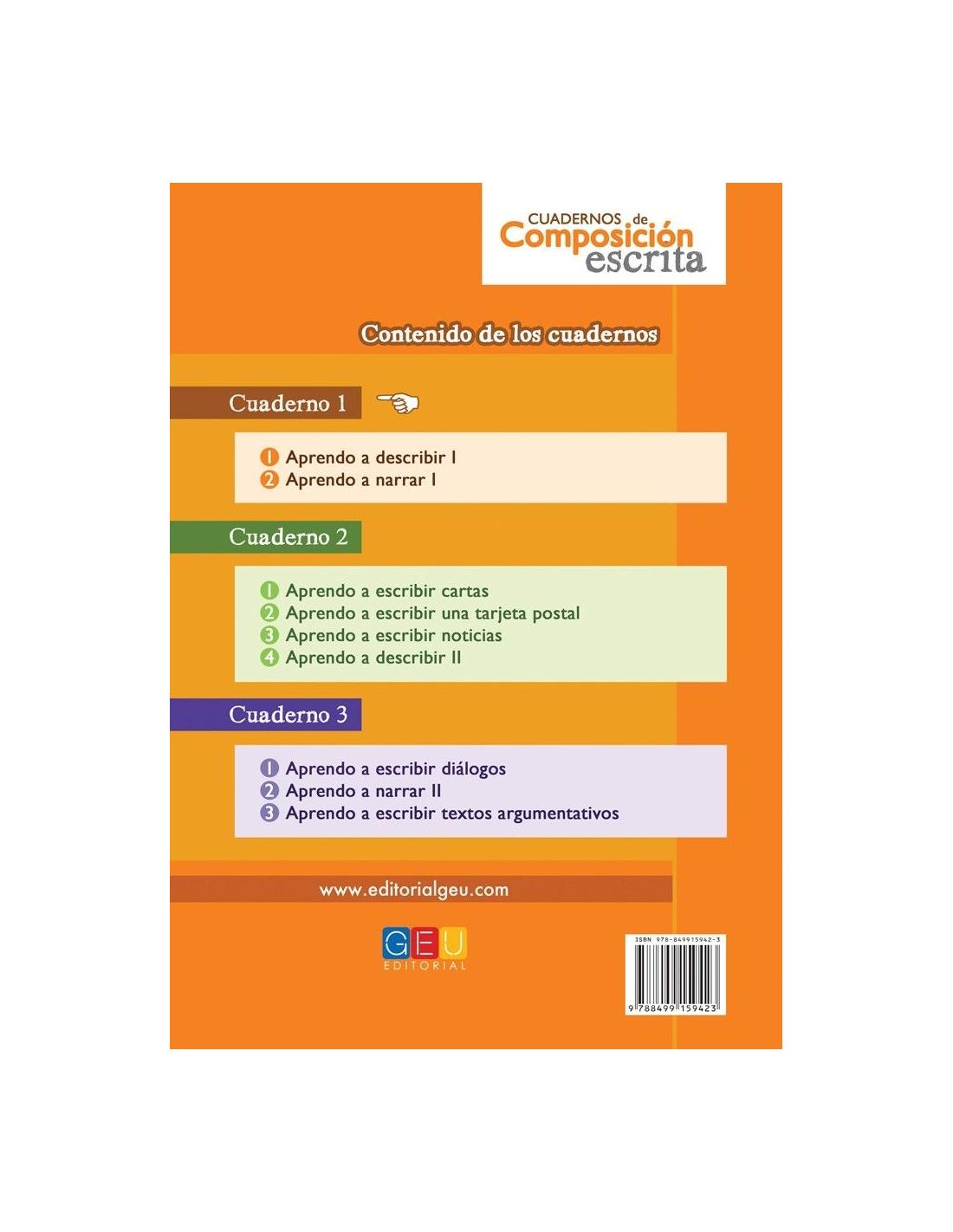 Cuaderno de composición escrita 1 forma parte de una colección compuesta por 3 cuadernos de trabajo con los que los alumnos desarrollarán las distintas estructuras de redacciones y narraciones de una forma sencilla y rápida.