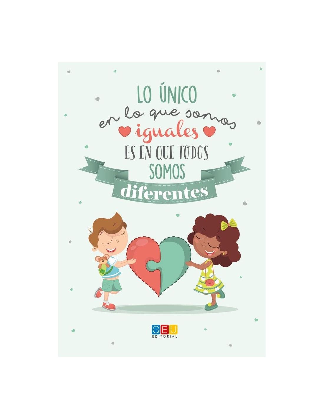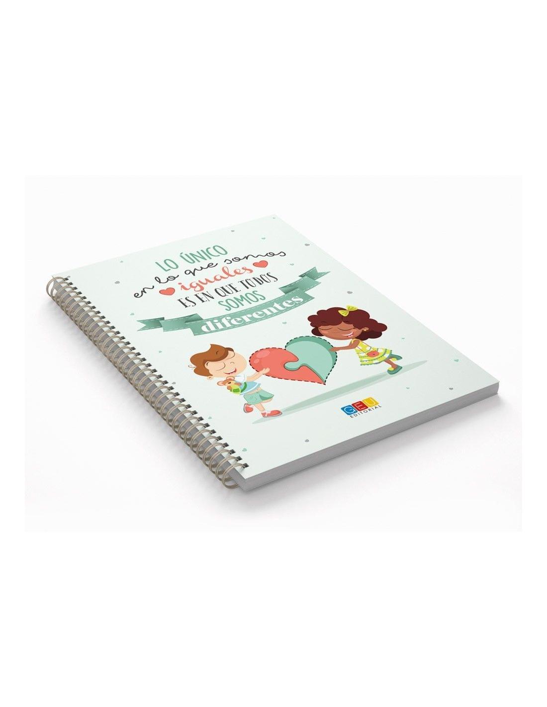 Libreta de tapa blanda en formato A5 con la frase Lo único en lo que somos iguales, es en que todos somos diferentes”. La ilustración de la libreta tiene como protagonistas a 1 niño y 1 niña sosteniendo 2 piezas de puzle que forman un corazón.