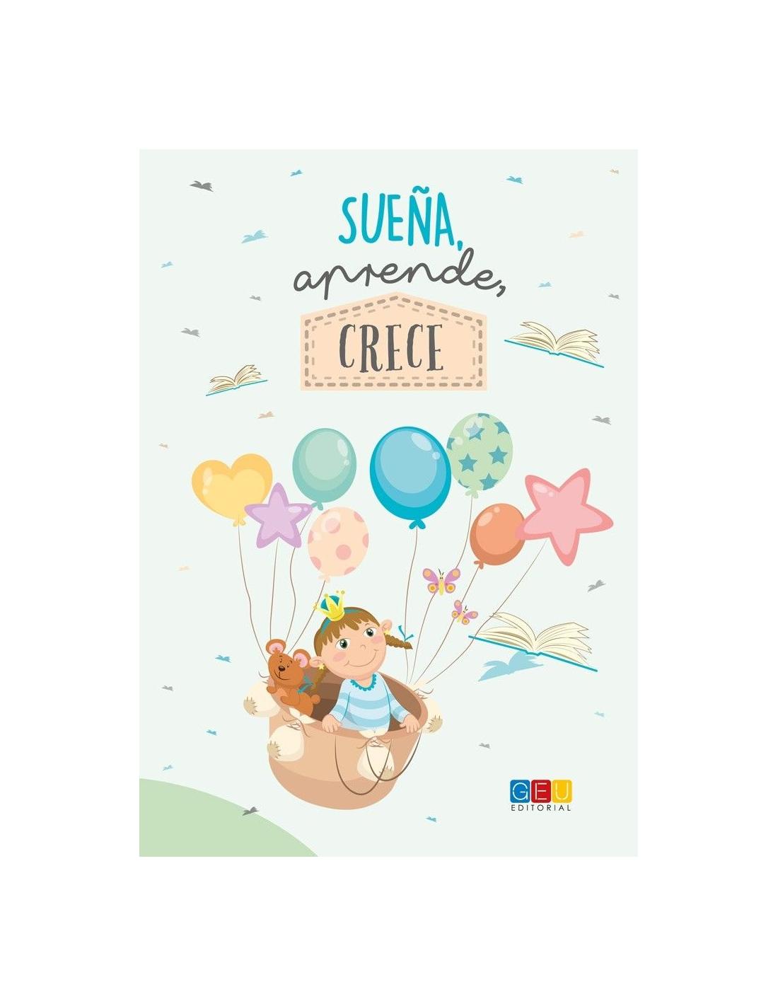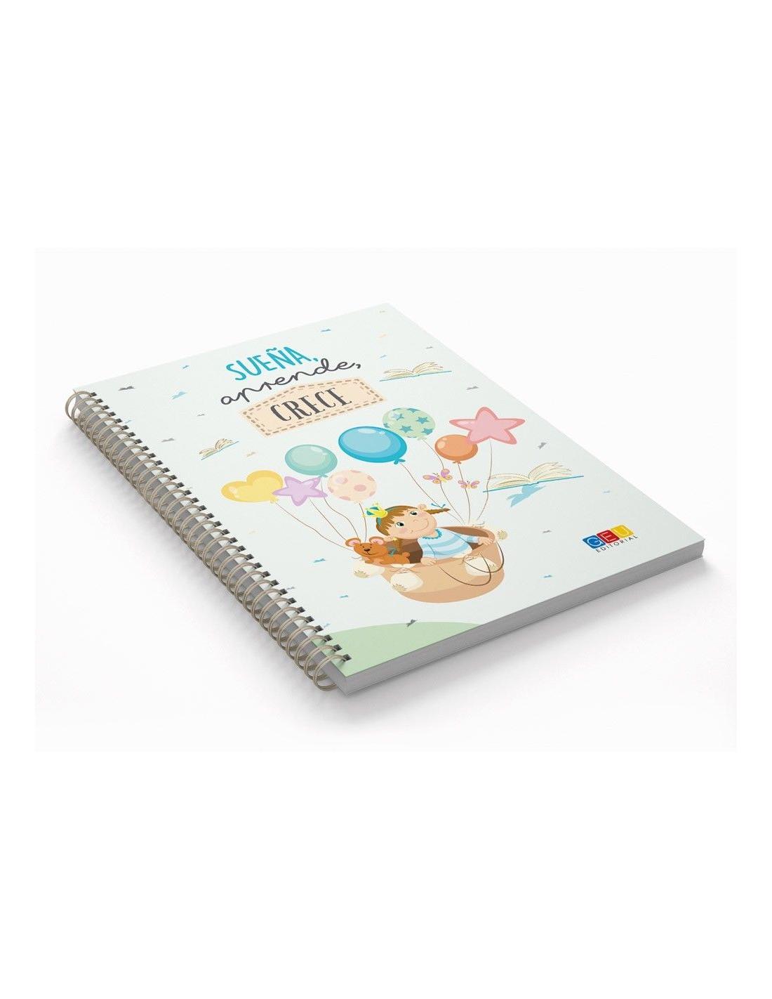 Libreta de tapa blanda en formato A5 con la frase “Sueña, aprende, crece”. La ilustración de la libreta tiene como protagonista a una pequeña que vuela gracias a unos globos de helio.