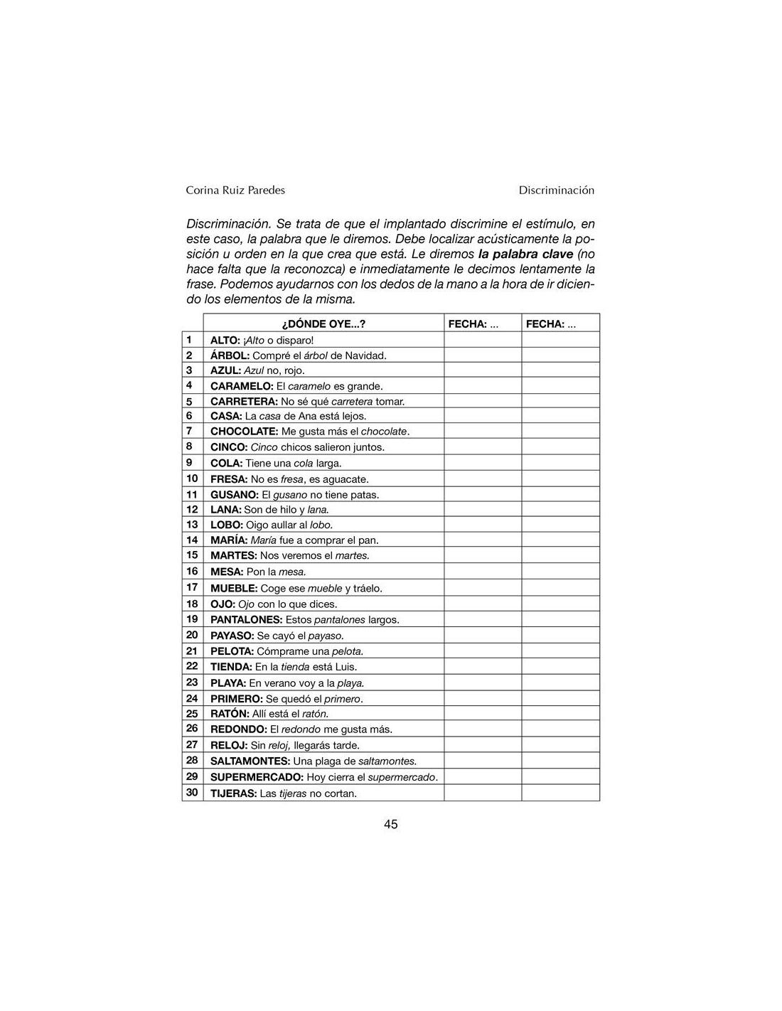 Se trata de un manual abierto, es decir, podemos elegir los ejercicios a trabajar, añadir más…; escribir nuestro plan de cada sesión y con cada uno de nuestros pacientes usuarios de implante coclear.