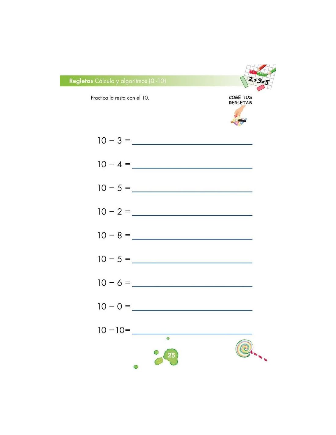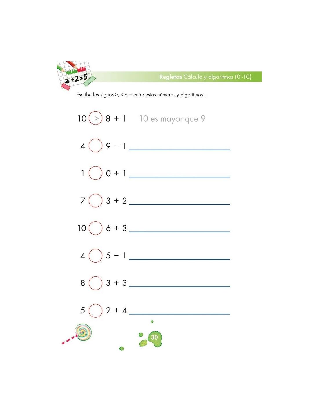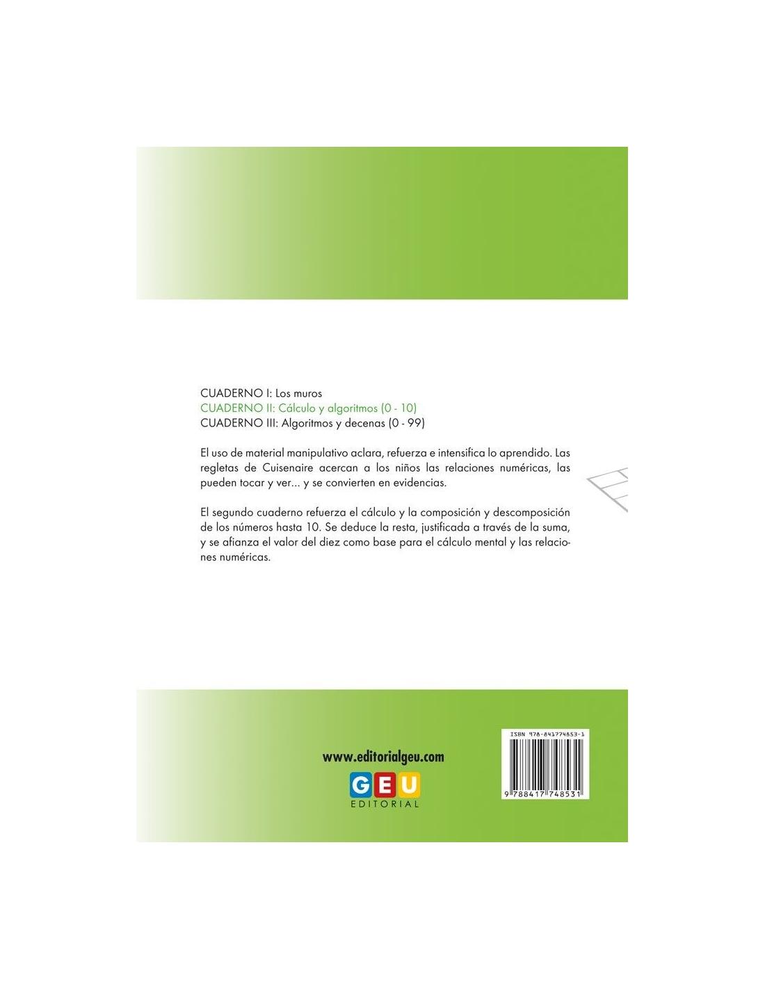 El segundo cuaderno refuerza el cálculo y la composición y descomposición de los números hasta 10. Se deduce la resta, justificada a través de la suma y se afianza el valor del diez como base para el cálculo mental y las relaciones numéricas.
