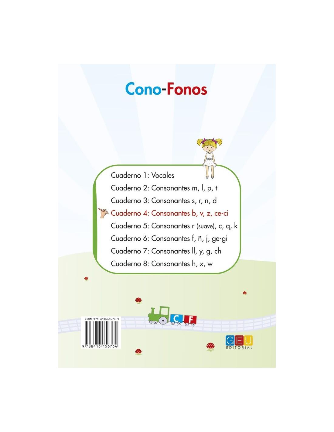 Cono-Fonos 3: ¡Sé leer y escribir! Cuaderno 4: Consonantes b, v, z, ce-ci, forma parte de una colección de 8 cuadernos de enseñanza-aprendizaje de la lectoescritura, mediante una secuencia acumulativa de fonemas, onomatopeyas, apoyo articulatorio y grafemas.