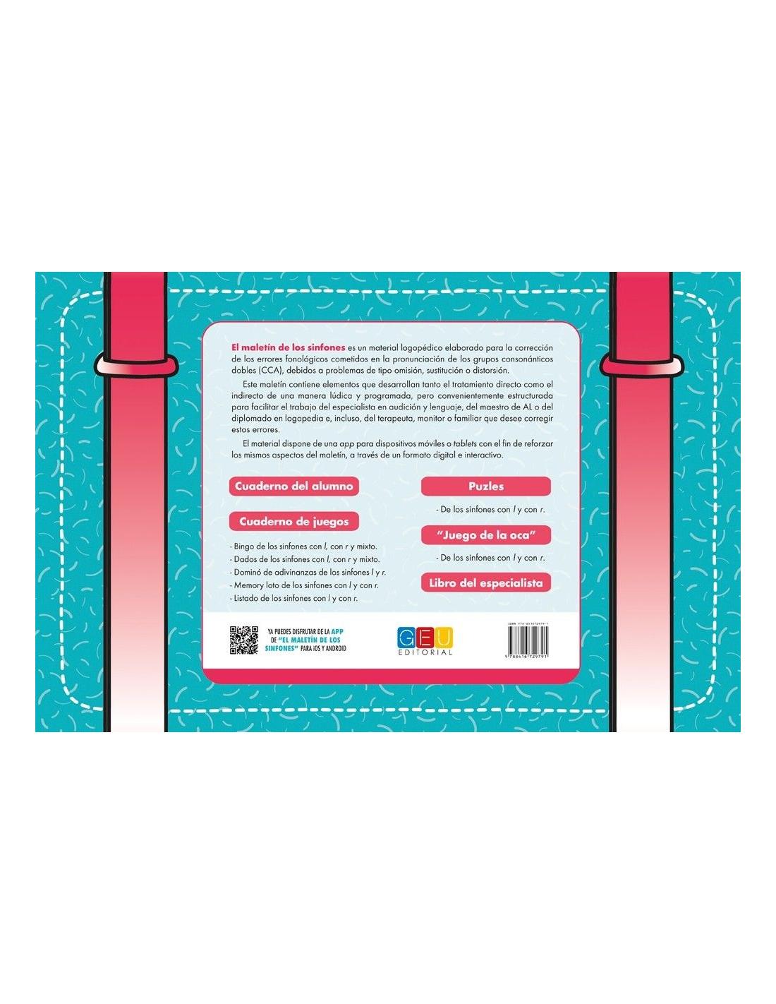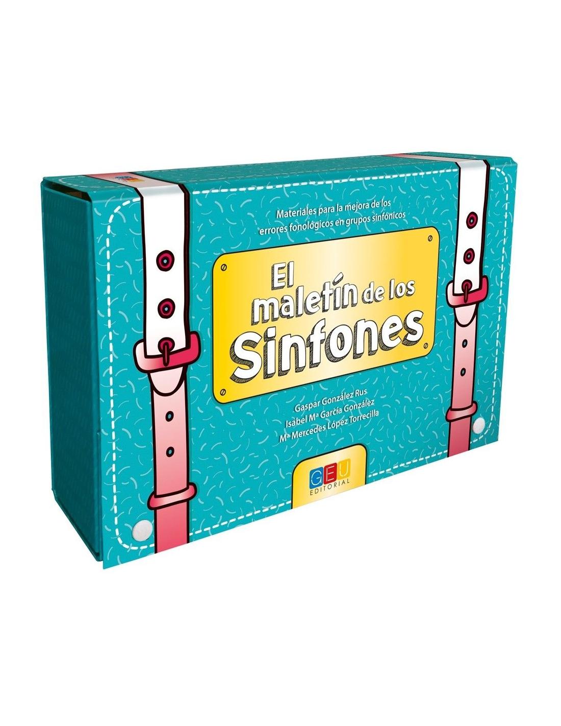 El maletín de los sinfones es un material especialmente diseñado para corregir errores fonológicos originados por la pronunciación incorrecta de los grupos consonánticos. El maletín contiene un total de cinco materiales: el libro del especialista, el cuaderno del alumno (que también puede adquirirse por separado), el cuaderno de juegos, el libro de puzles y, por último, el juego de la oca. Todo ello en un práctico y vistoso maletín fácilmente transportable.