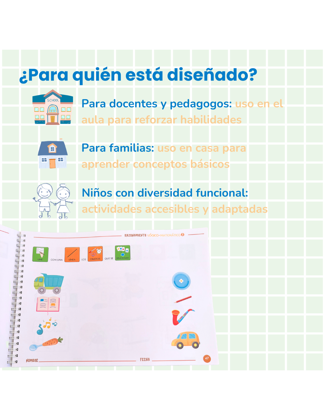 Este tercer cuaderno de la colección está diseñado para seguir estimulando el razonamiento lógico-matemático en niños de Infantil y en alumnado con necesidades educativas especiales. Sus actividades permiten consolidar y ampliar habilidades cognitivas con ejercicios más variados y complejos.