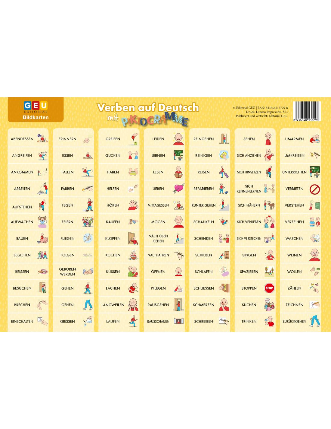 Lámina rígida de alta calidad para aprender los verbos en alemán mediante pictogramas en letra mayúscula.